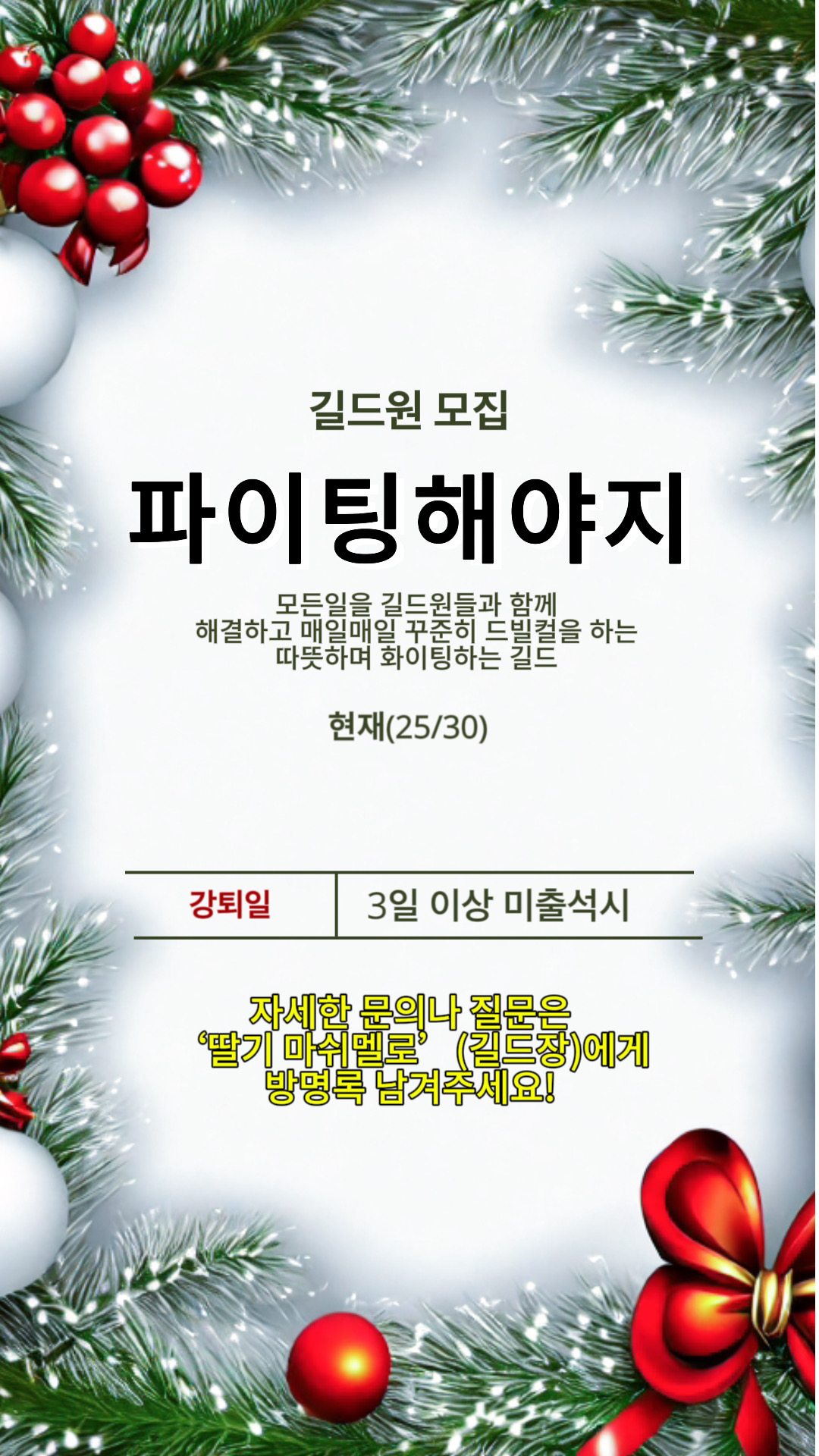 길드&친구 길드원을 모집해요!(25/30) 딸기마쉬멜로 2023-12-25 02:02 142 2 공유 공유 URL 복사 페이스북 왓츠앱 카카오톡 라인 레딧 닫기 공유 #길드원모집 0 1 댓글 2 삭제 이미지첨부 0/3000 등록