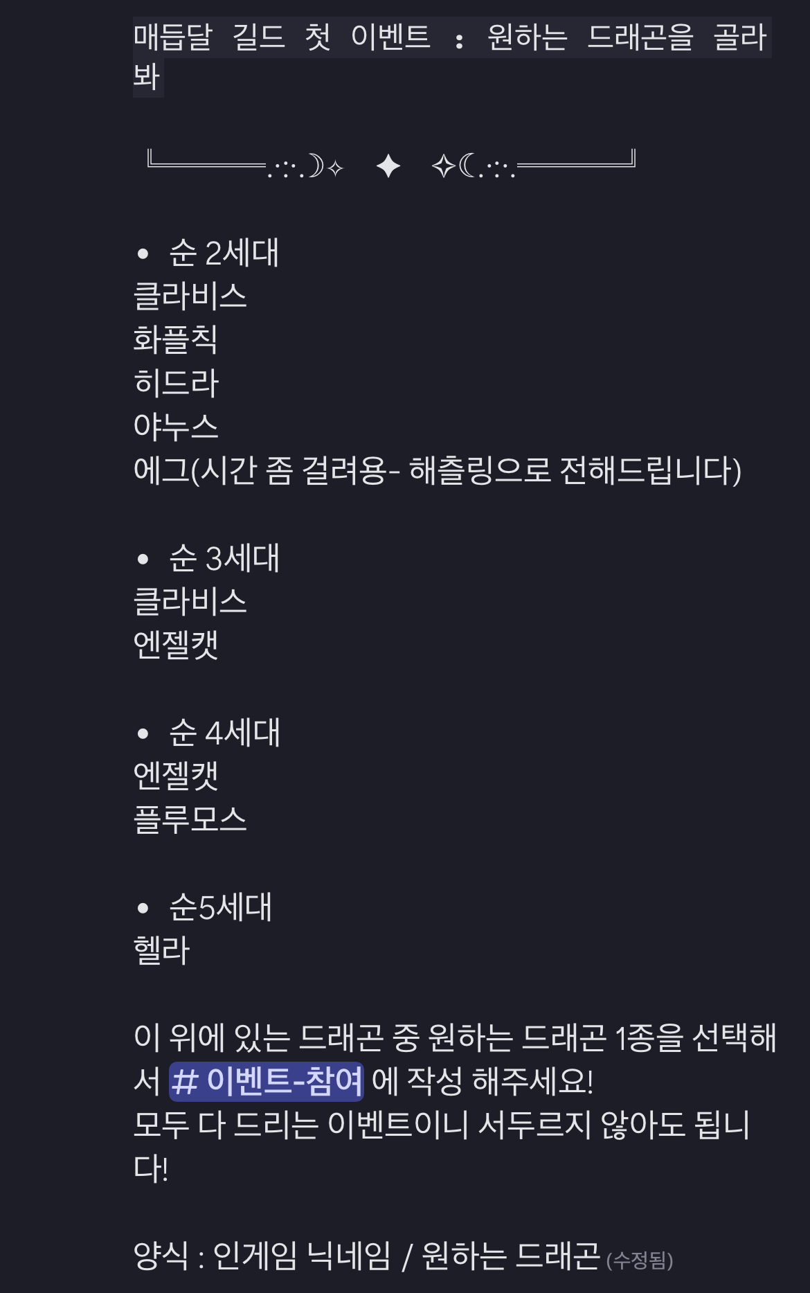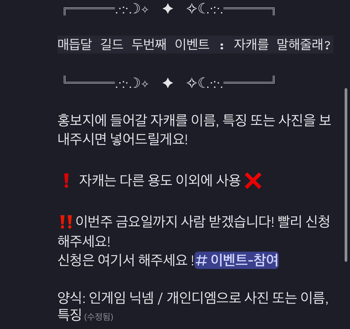 저희 길드는 짧으면 매주, 조금 길다면 매달마다 이벤트를 진행하고 있어요! 이벤트가 꾸준히 열릴 예정이니 들어오셔서 참여 해주셨으면 좋겠어요!
