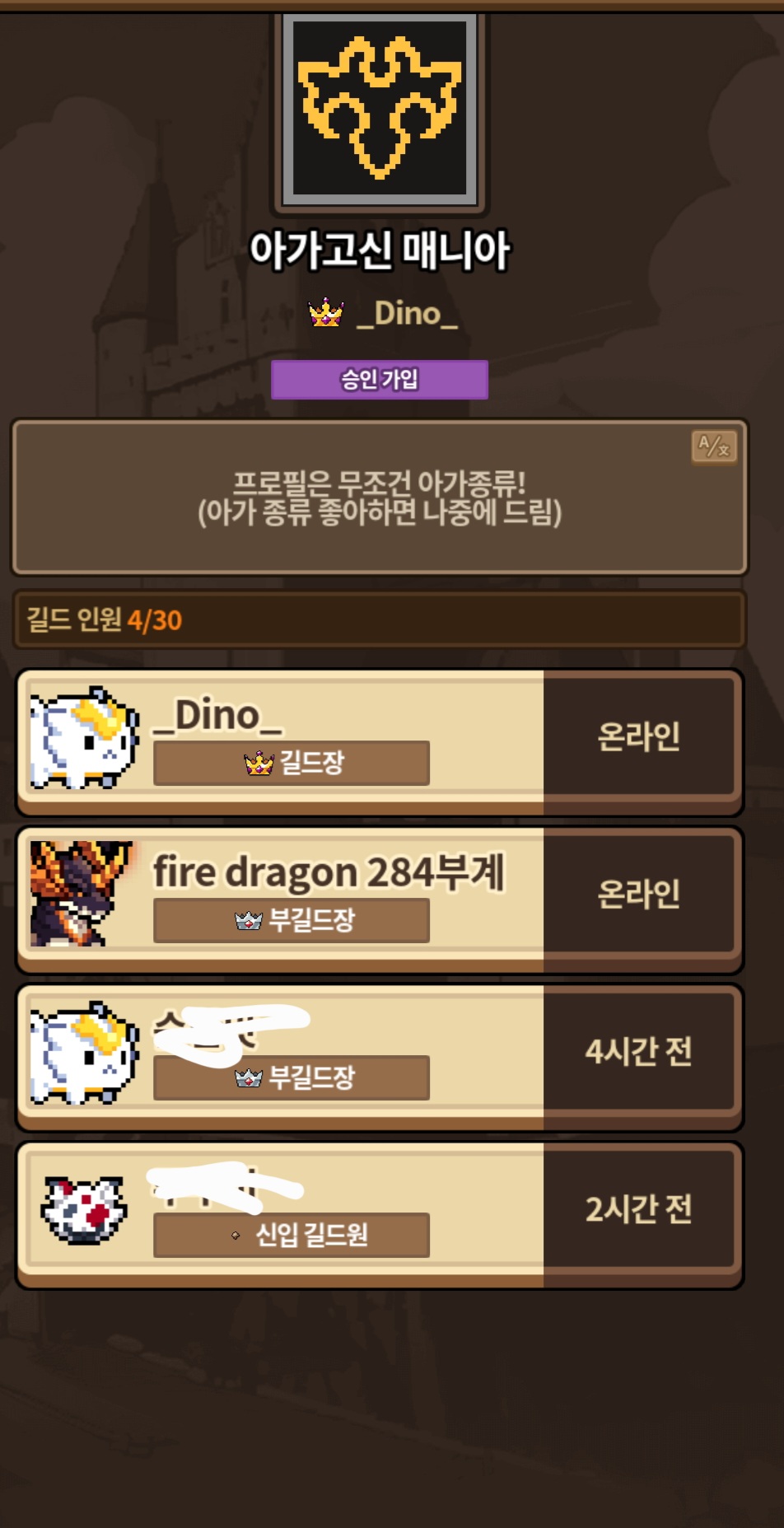 '아가고신 매니아' 길드에 오시길… 가끔식 나눔도 하고, 친철한 길드메이트를 경험해보길….