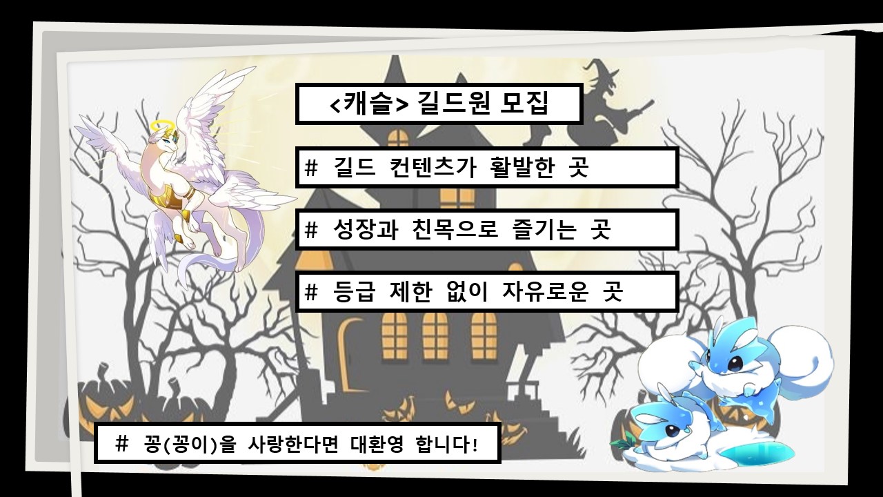 안녕하세요. 이번에 길드 컨텐츠가 나와 다시 새롭게 운영 시작하게 된 캐슬 길드 입니다. 따로 커트라인은 없이 모집을 하고 있고 7일이상 미접 시 사유가 없다면 강퇴, 길드 컨텐츠가 나오면 규칙이 추가될 예정입니다. 현재 약 13명정도가 길드원으로 활동할 예정이며, 첫 길드 컨텐츠는 상위권을 노리기 힘들 수 있겠지만 꾸준히 참여하려고 하니 함께 나아가실분들 모집합니다. 감사합니다.
