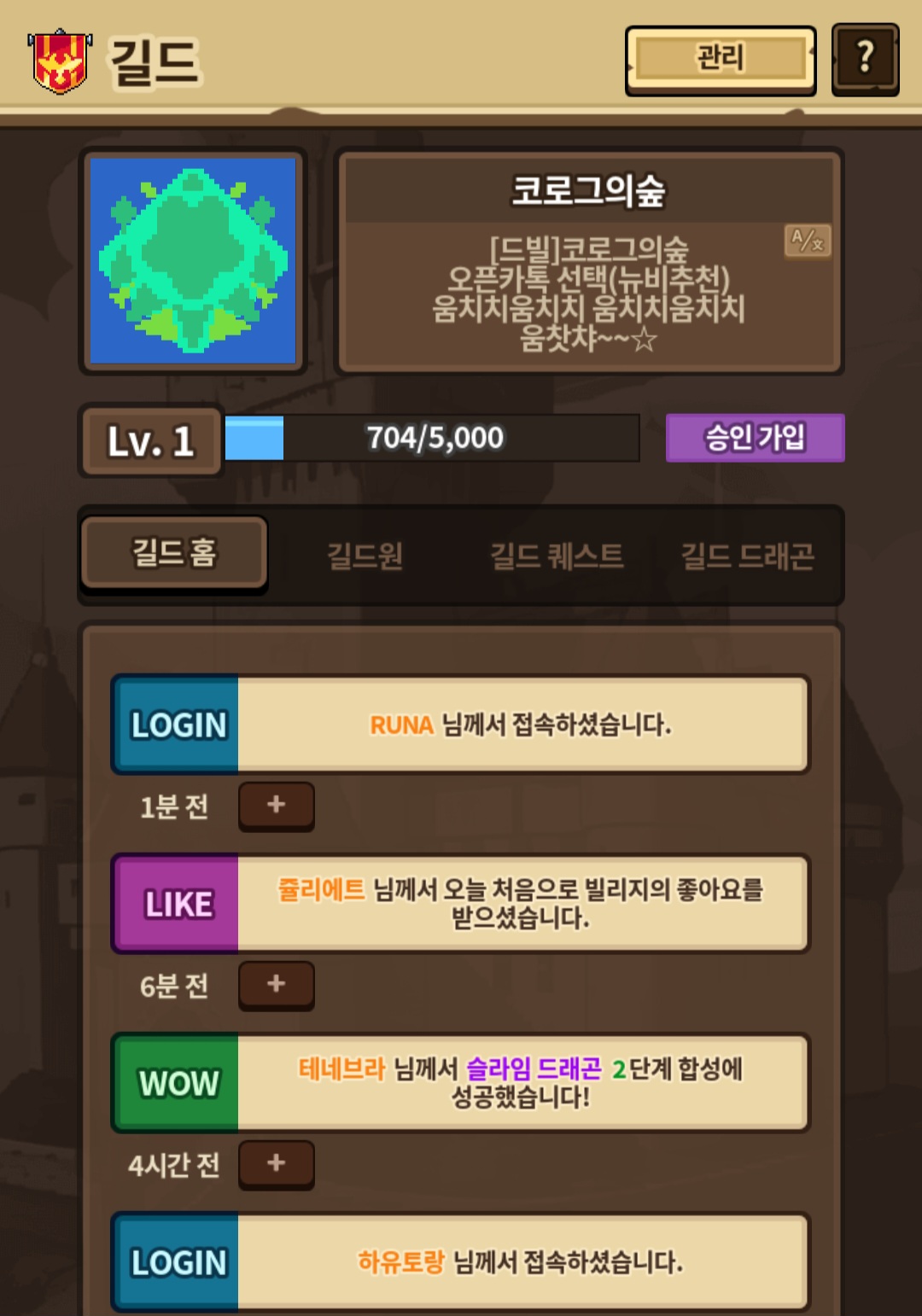 길드컨텐츠 함께해주실 코로그의 숲의 신규 길드원을 모집하고 있습니다.