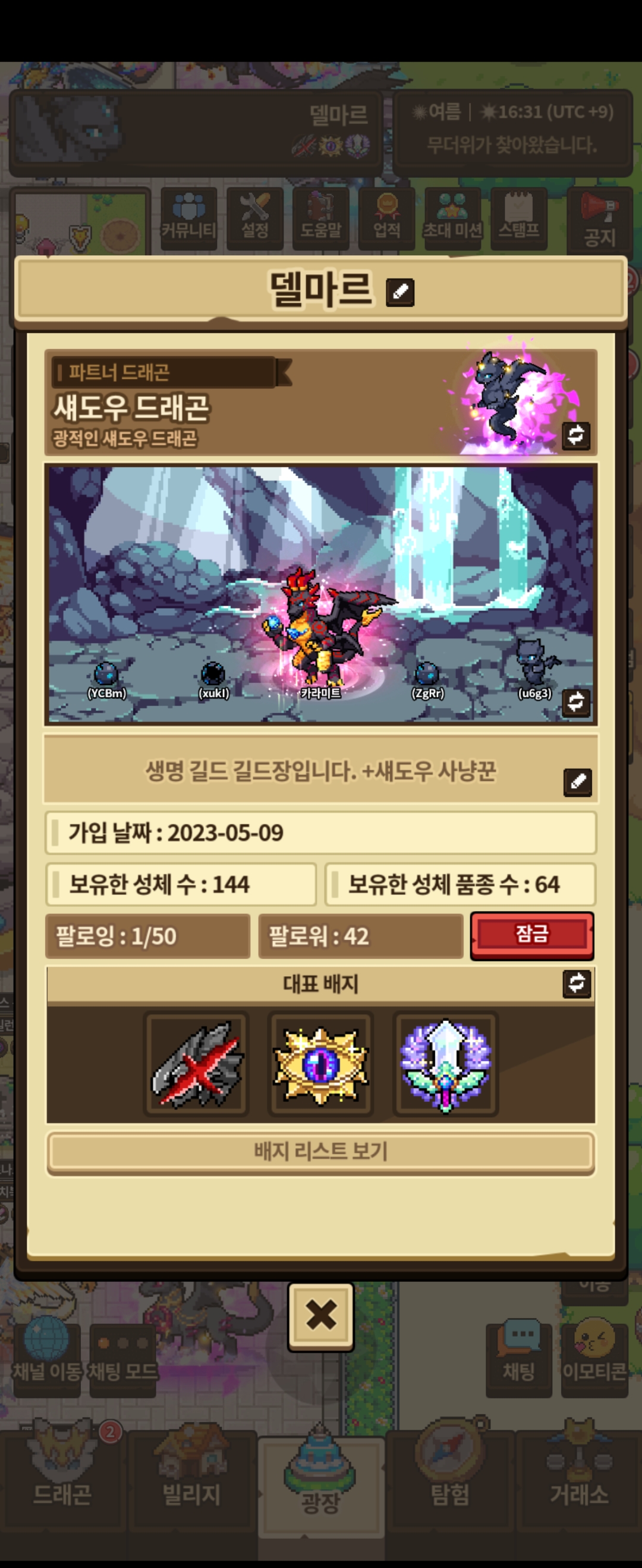 우선 길드 가입 조건은 특별한 성격 (몰입/유능/완주 등) 10마리 이상 or 성체 드래곤 30마리 이상입니다!
