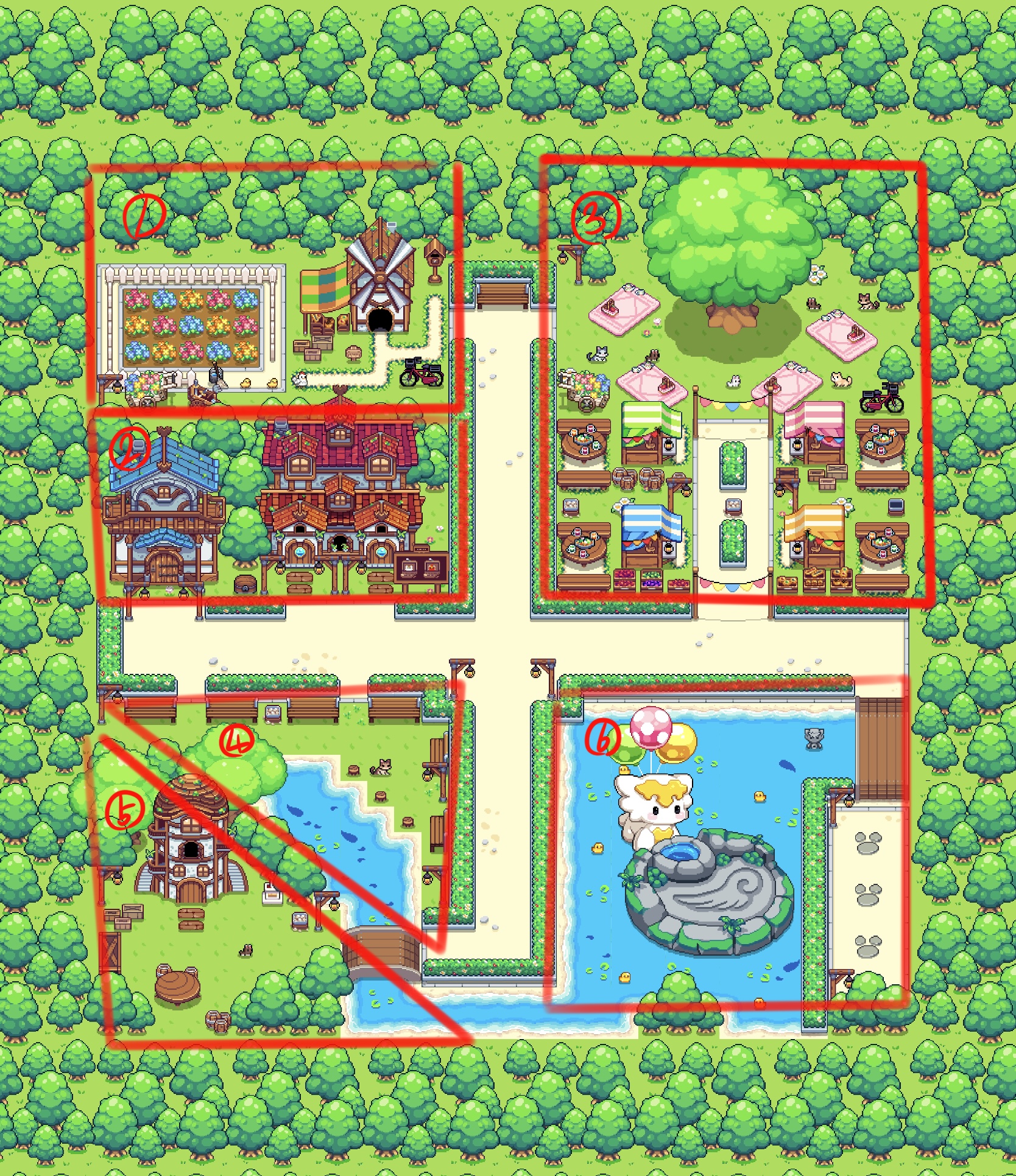 - 4. 마을에서 가장 조용한 강가입니다. 조용하기 때문에 물고기들이 많이 발견되는 장소이기도 합니다. 낚시를 위한 의자도 배치되어 있어서 낚시꾼들에게는 인기가 있는 장소입니다. 많은 물고기가 잡혀서, 고양이도 자주 출몰하는 장소입니다.