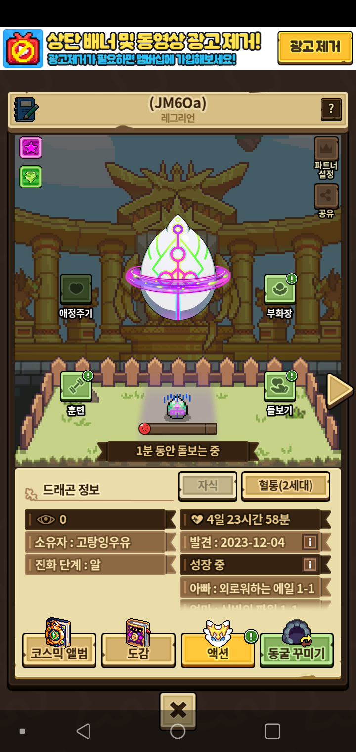 그냥 심심해서 교배 해봤는데 10.75%확률을 뚫고 1트에 레그리언이... 필요 하신분있을까요? 잡 2세고 훈련× 돌봄× 부화장 배치 × 입니다