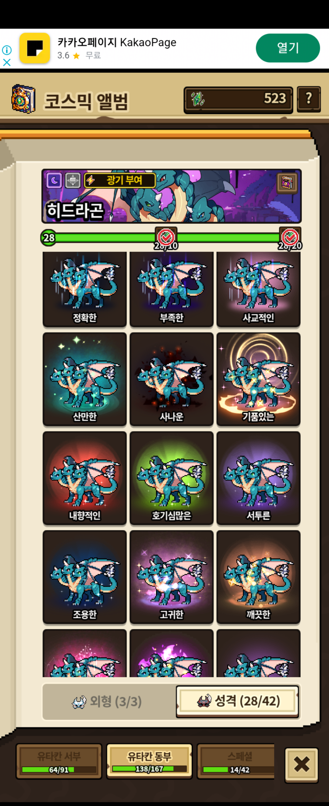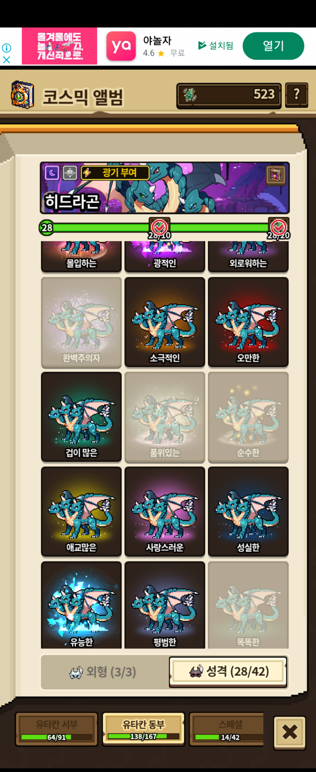 고귀한 만든다고 오랴걸렸지만 이렇게 만들고 나니 뿌듯하네요~ 교배용 특성상 품위 순수가 안되고 히드라곤은 완주자가 안되는거ㅠ같으니 아쉽긴 하지만 만족하려합니다~ 이제는 일반성격이나 이벤트 성격 주면서 39개 채워보겠습니다~