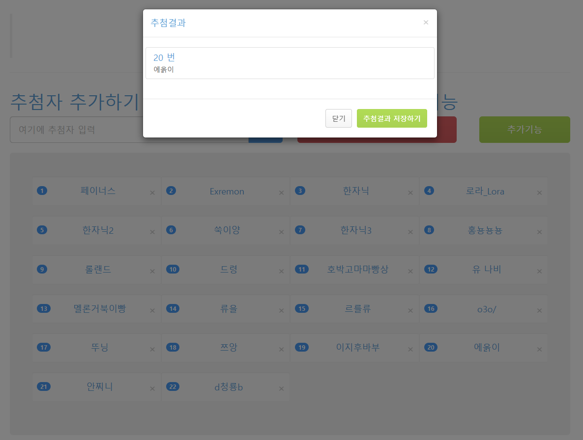 닉네임이 한자신 분들은 아래에서부터 1~n으로 설정해 추첨 진행하였습니다.