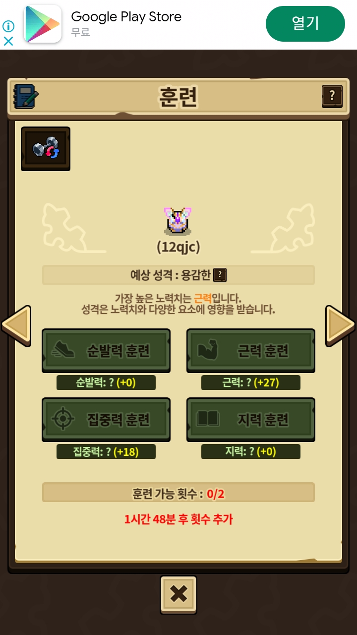 초기 훈련값:순발력0,집중력 5,근력0,지력20