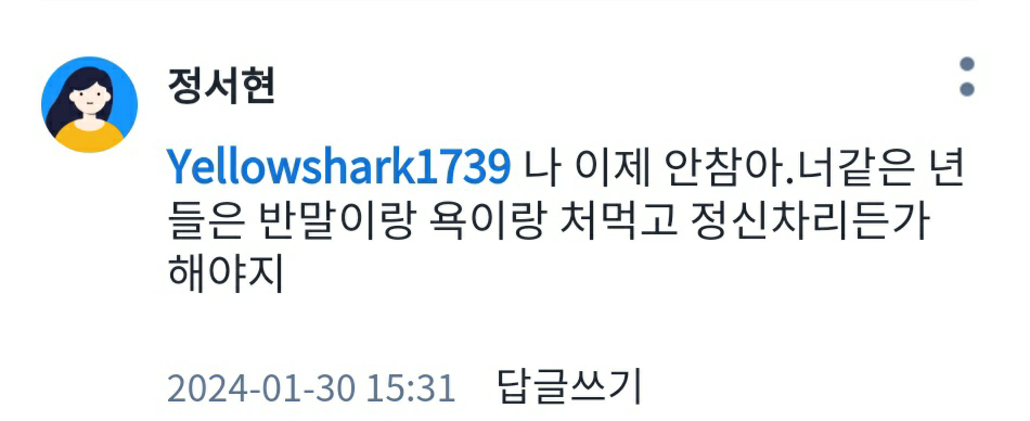합성이 아님 놀랍게도ㅋㅋ 예전일가지고 징징대는거 맞는데 정서현이 나한테 먼저 욕설쳐해도 그거갖고 왜 욕쓰냐 뭐라 하니까 내가 정지먹고 그러더라ㅠㅠㅋㅋ 관리 안하냐?
