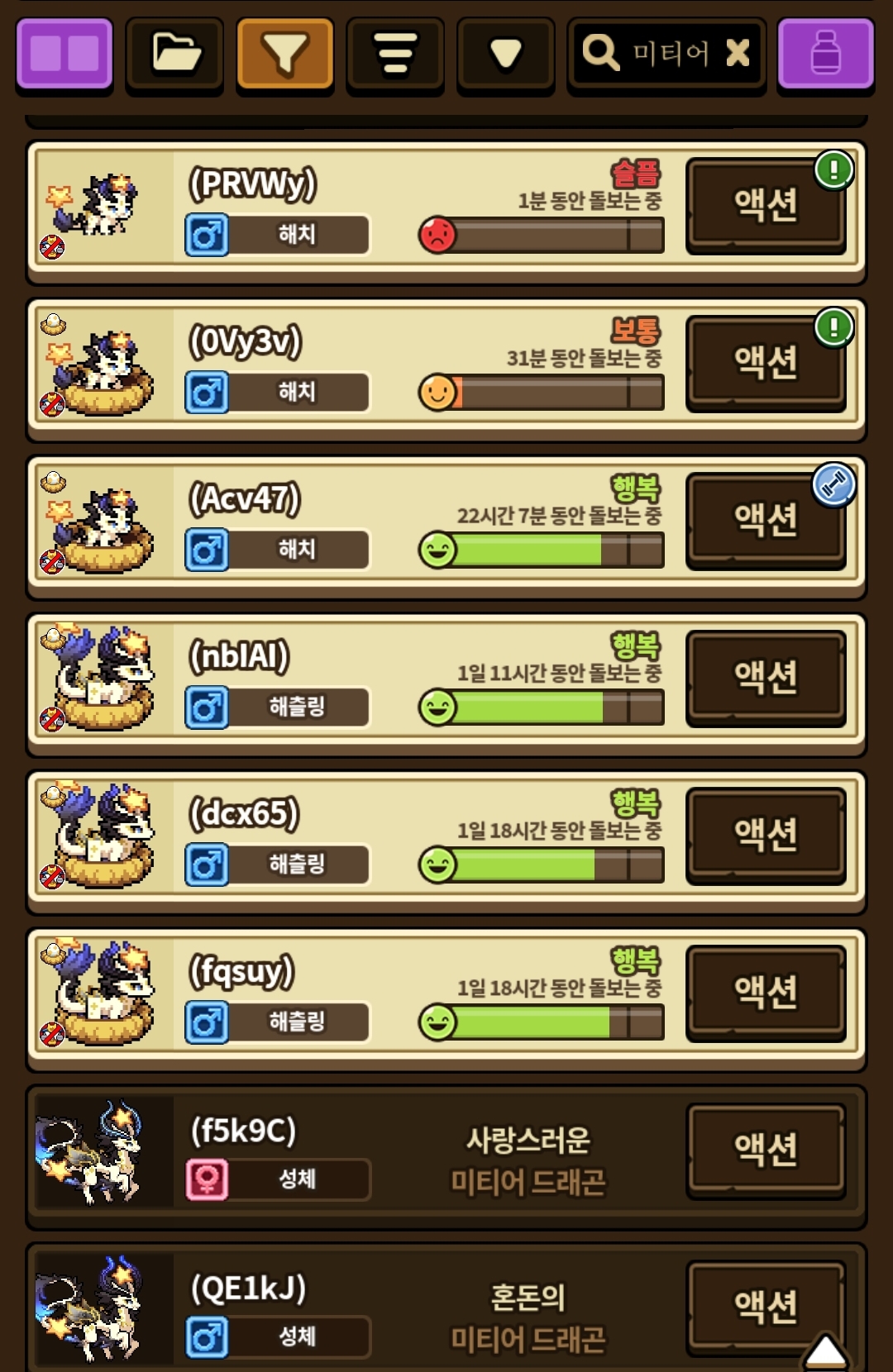 저도 믿기지가 않네요… 오늘이 이벤트 마지막 날이라 고귀한은 힘들것같아서 순수한, 품위있는 성격이라도 만들고자 부랴부랴 사흘 전부터 1세대 미티어들 열심히 교배시켰는데 2세대 성비 이게 뭐죠ㅋㅋㅋㅋㅋㅋㅋㅋㅋ