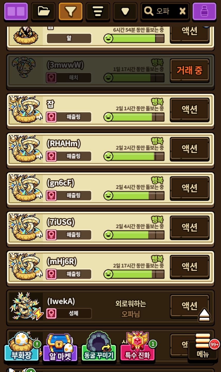 1세대에서는 수컷 한 마리에 여아만 주구장창.. 1세대는 성별교환이 쉽지만