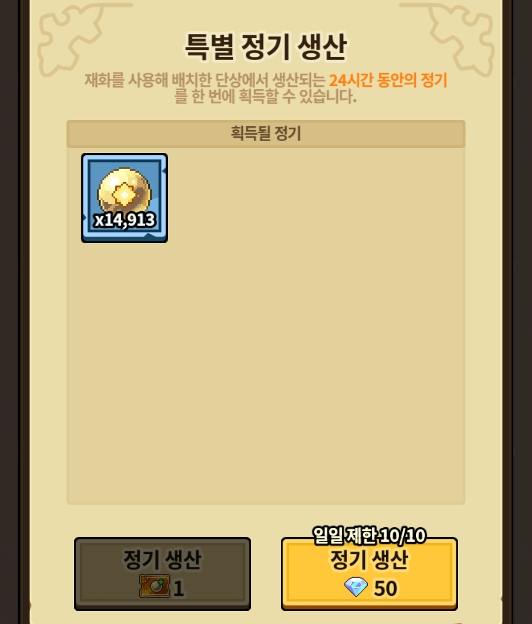 하루당 수확할 수 있는 정기 생산량이 평균 14000 후반에서 15000개이군요. 2주간 모으면 특진 한마리 완성 가능합니다. 여러분들은 몇자리까지 늘리셨나요?