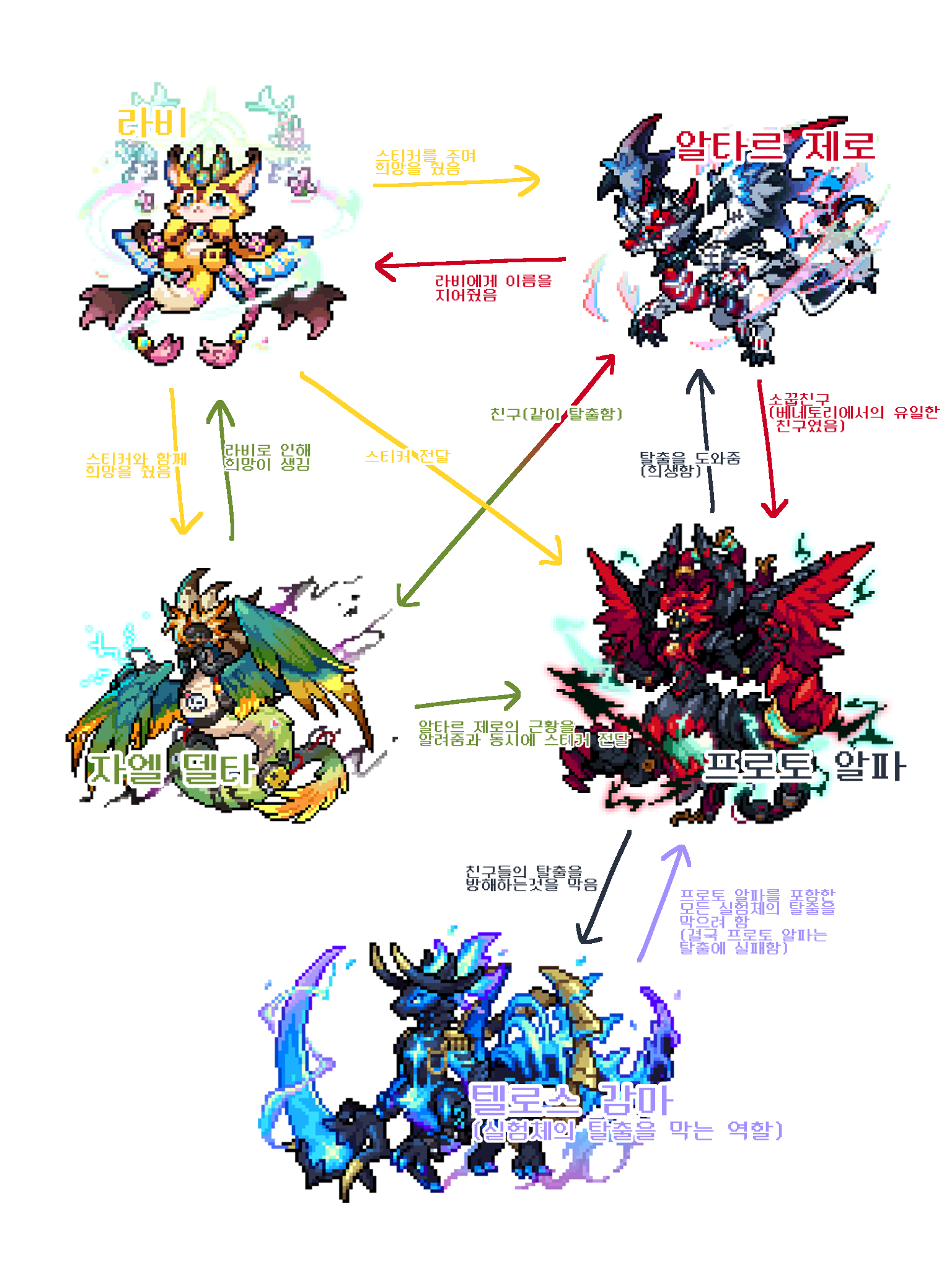 - 프로토 알파와 텔로스 감마는 사이가 좋지 않습니다(교배불가)