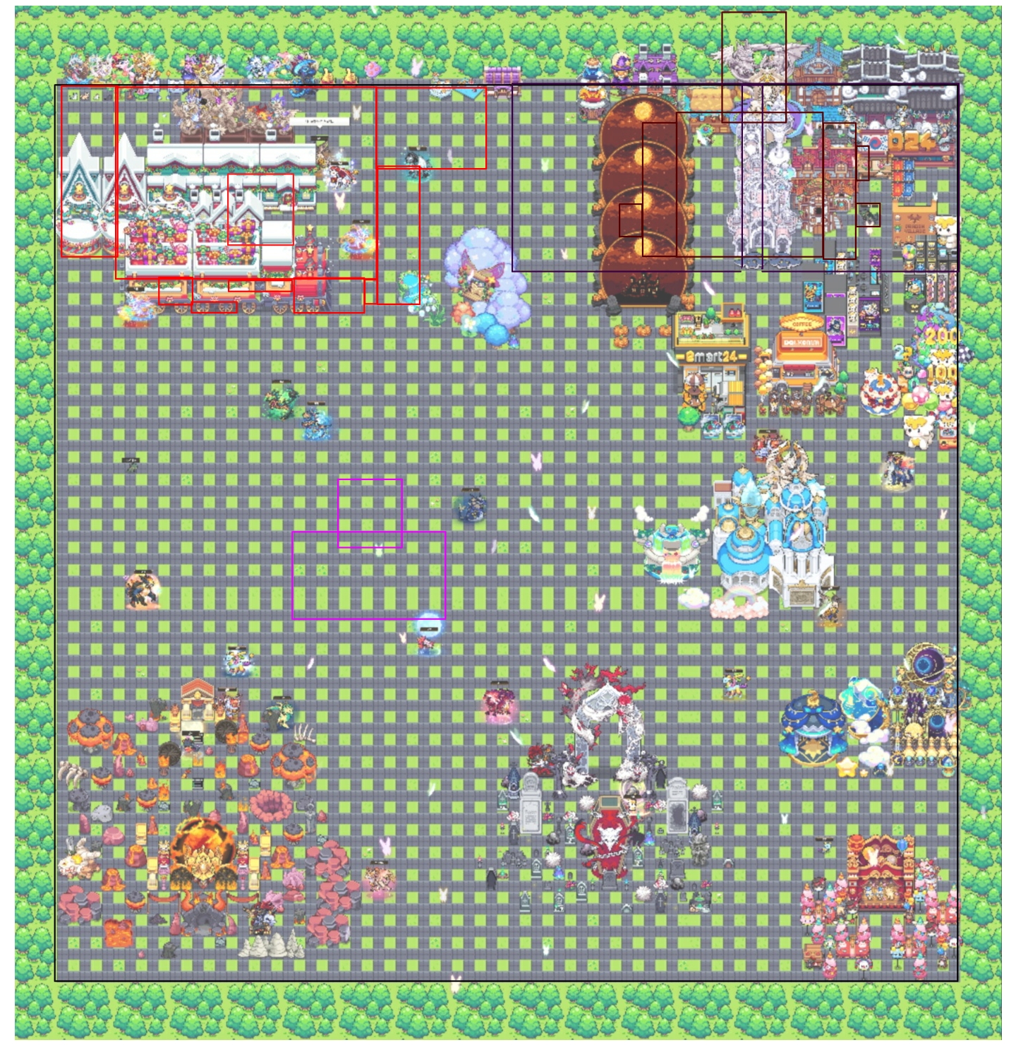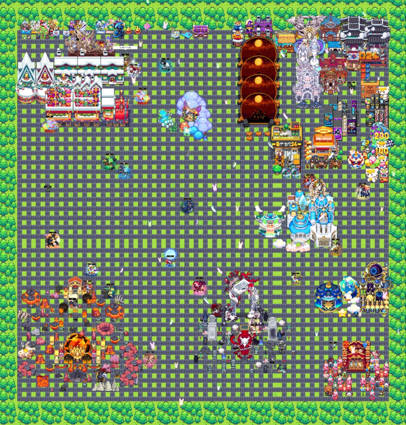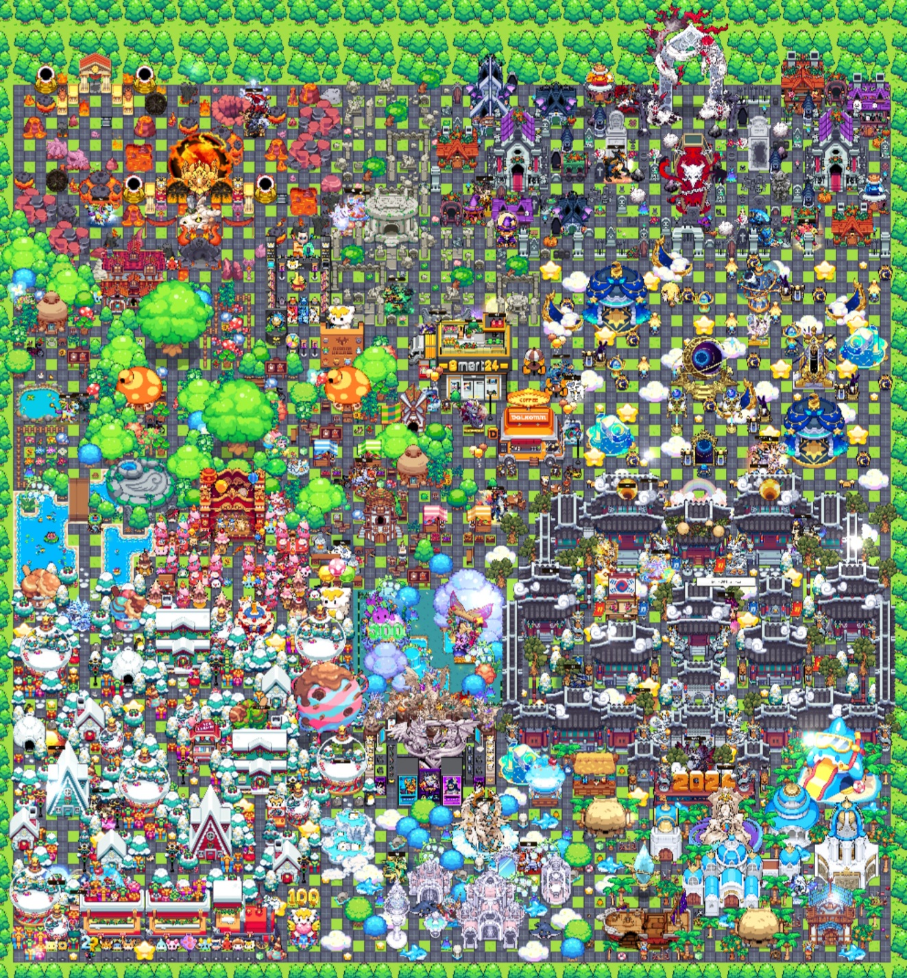 빌리지 크기가 잘 감이 안와서 일단 바닥에 아무것도 없는채로 체크무늬 넣어주고,. 넣고싶은 컨셉의 빌리지 템들을 막 꺼내보고 생각해보기.