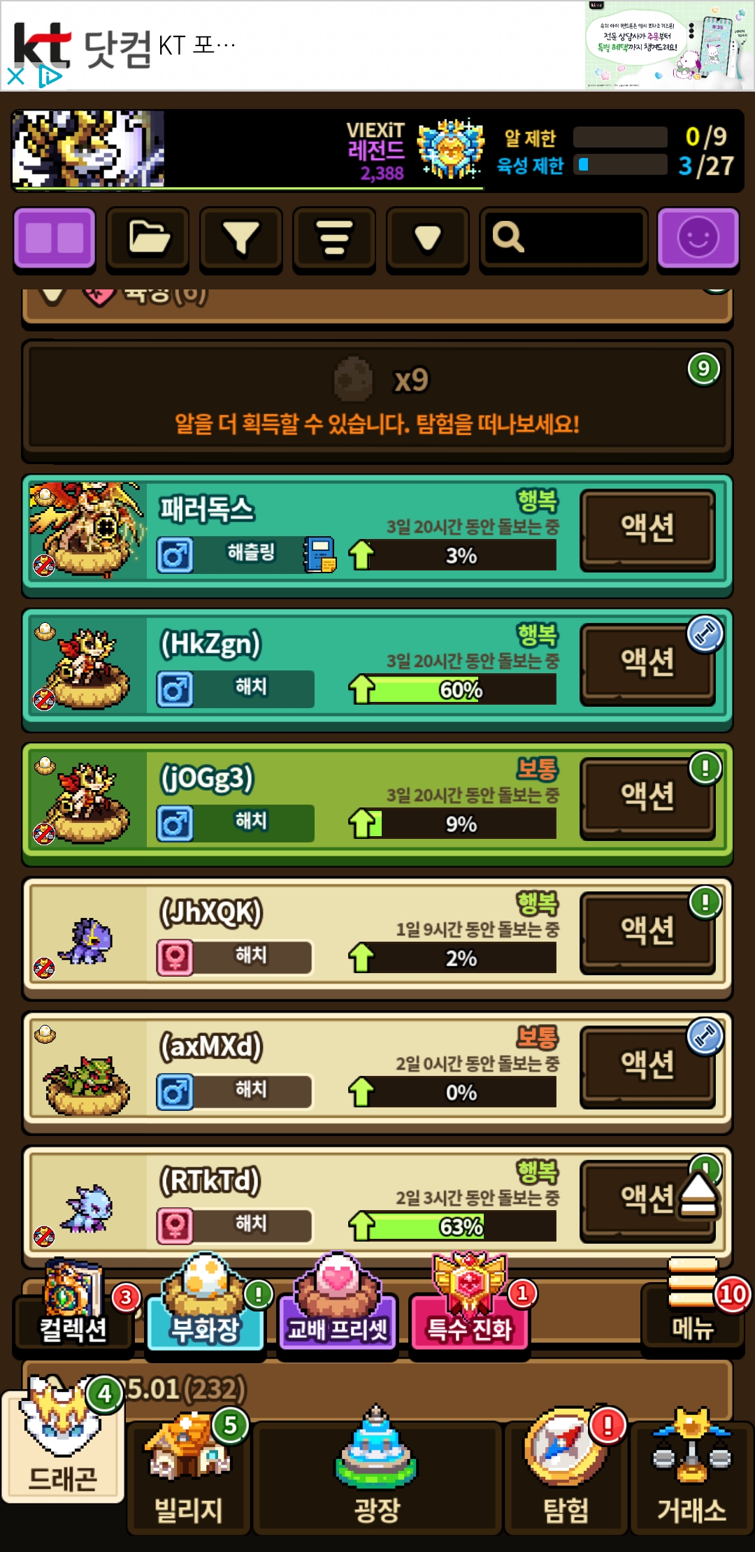 텅 빈 육성칸 보니까 속이 시원하네요 키우고싶지도 않은 드래곤을 성격작도 안하고 키우려니 진심 토나오는줄. 같은 이유로 이벤트 끝난 뒤로도 꿈세계는 쳐다보지도 않을거같습니다