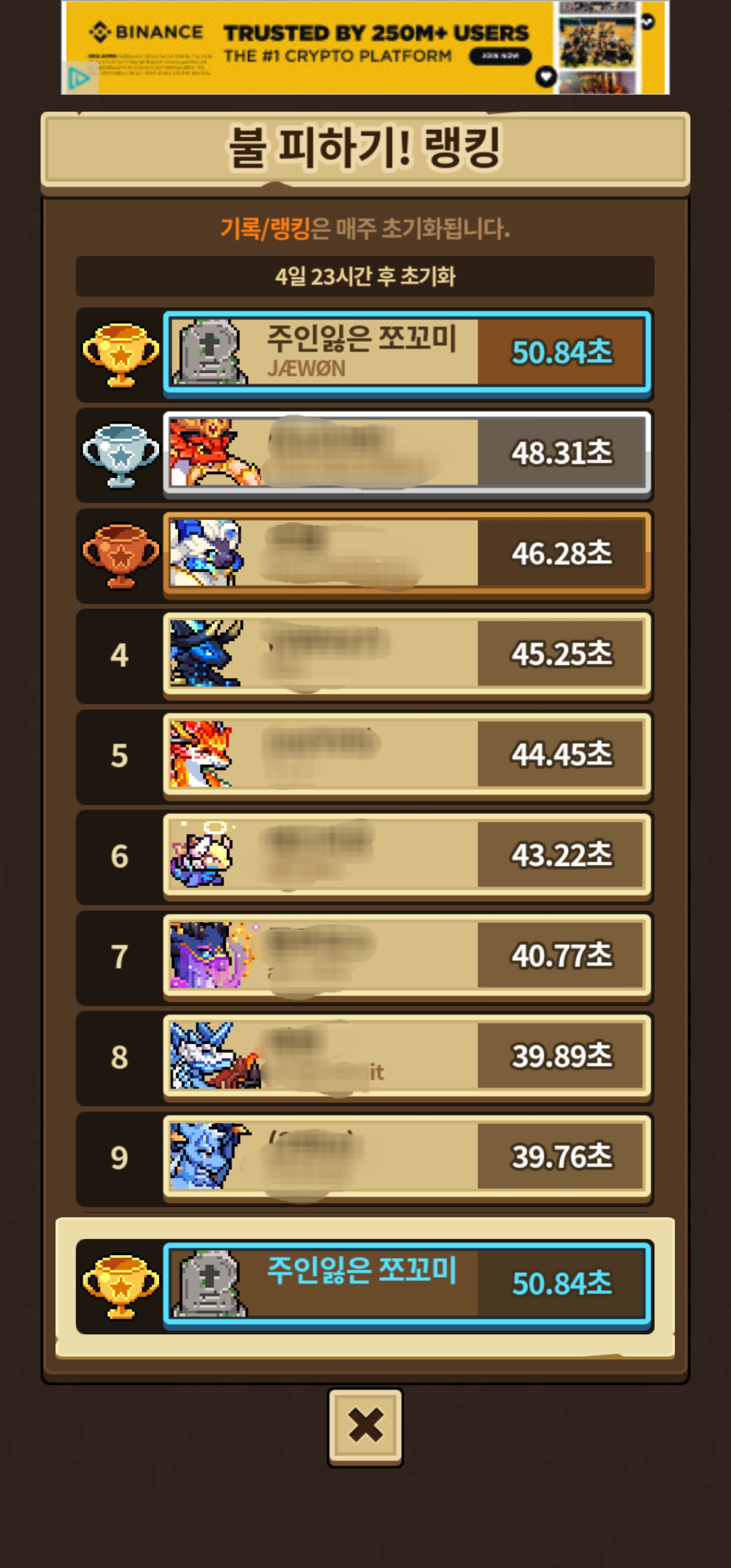 저는 그중에서도 불 피하기가 가장 재밌네요! 간신히 50초대 등극! 곧 자랑게시판으로 옮겨요!