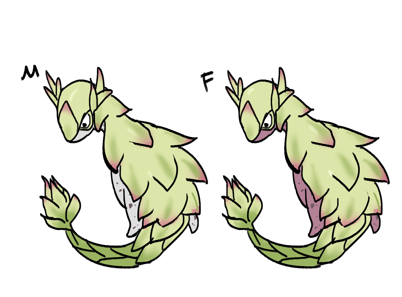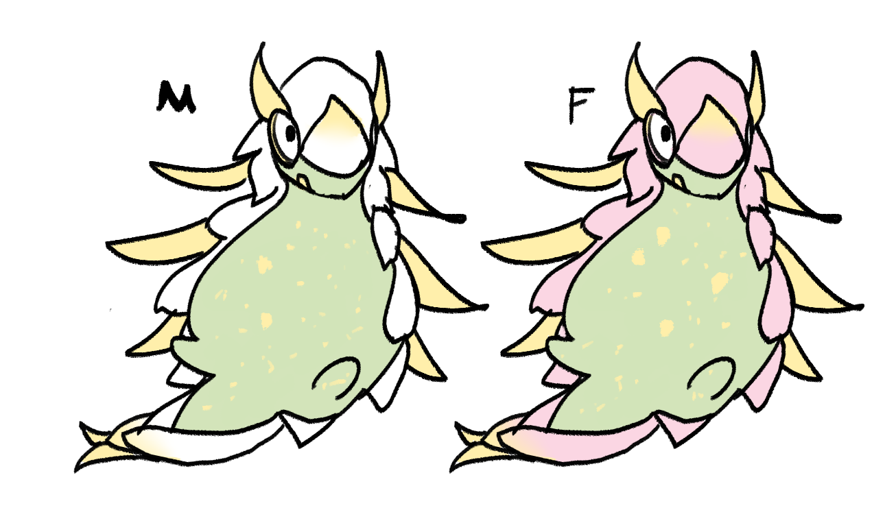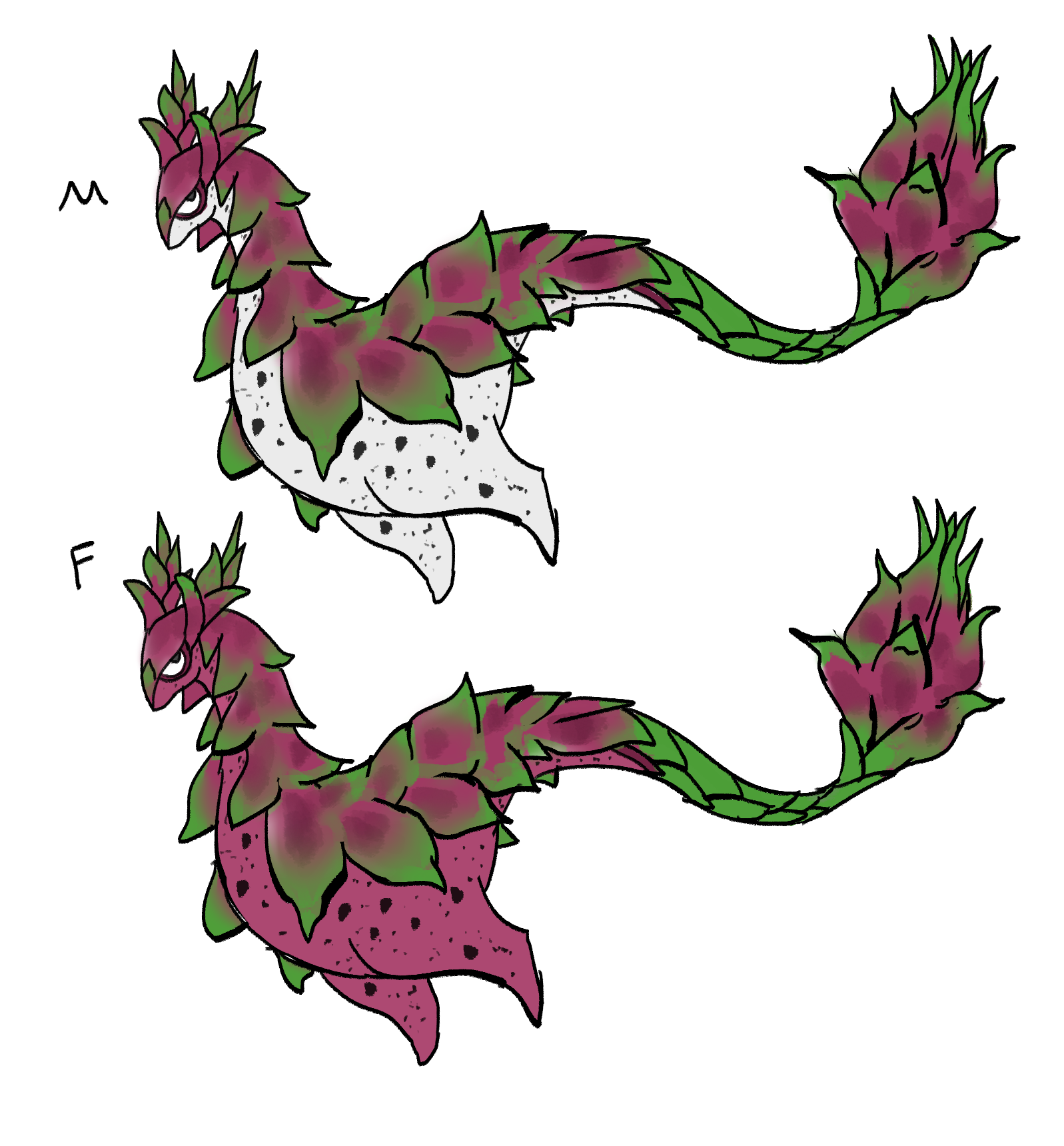 그의 비늘은 익은 열대 과일처럼 선명한 색으로 빛나고, 꼬리 끝에는 둥그스름하고 탐스러운 과일이 하나씩 맺힌다.