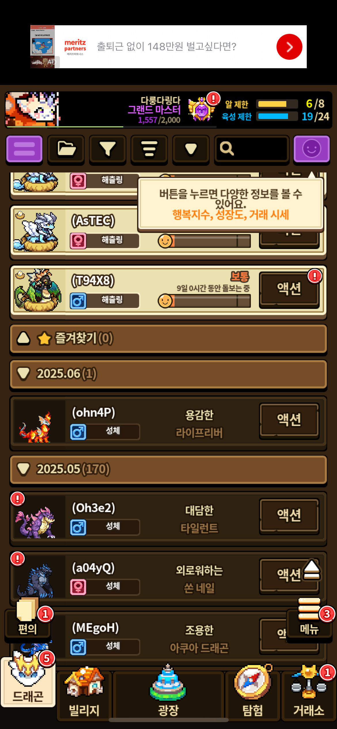 로그아웃도 해보았고 다른 순서로 나열도 해봤는데 획득시간 순서로 할 경우 라이프리버 이후로 성체가 된 해츨링들이 집계가 되지 않습니다..ㅠ