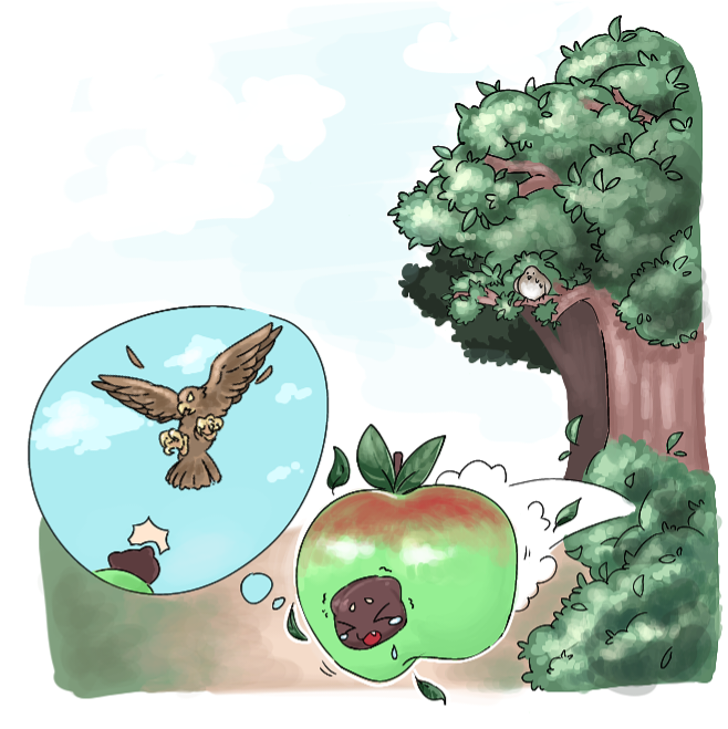 “어라? 진짜 사과가 아니네? 그런 줄도 모르고 크게 놀래켜서 미안해 벌레 친구. 나는 먹이로 사과만 먹지, 사과 속의 벌레는 먹지 않으니 안심해~"