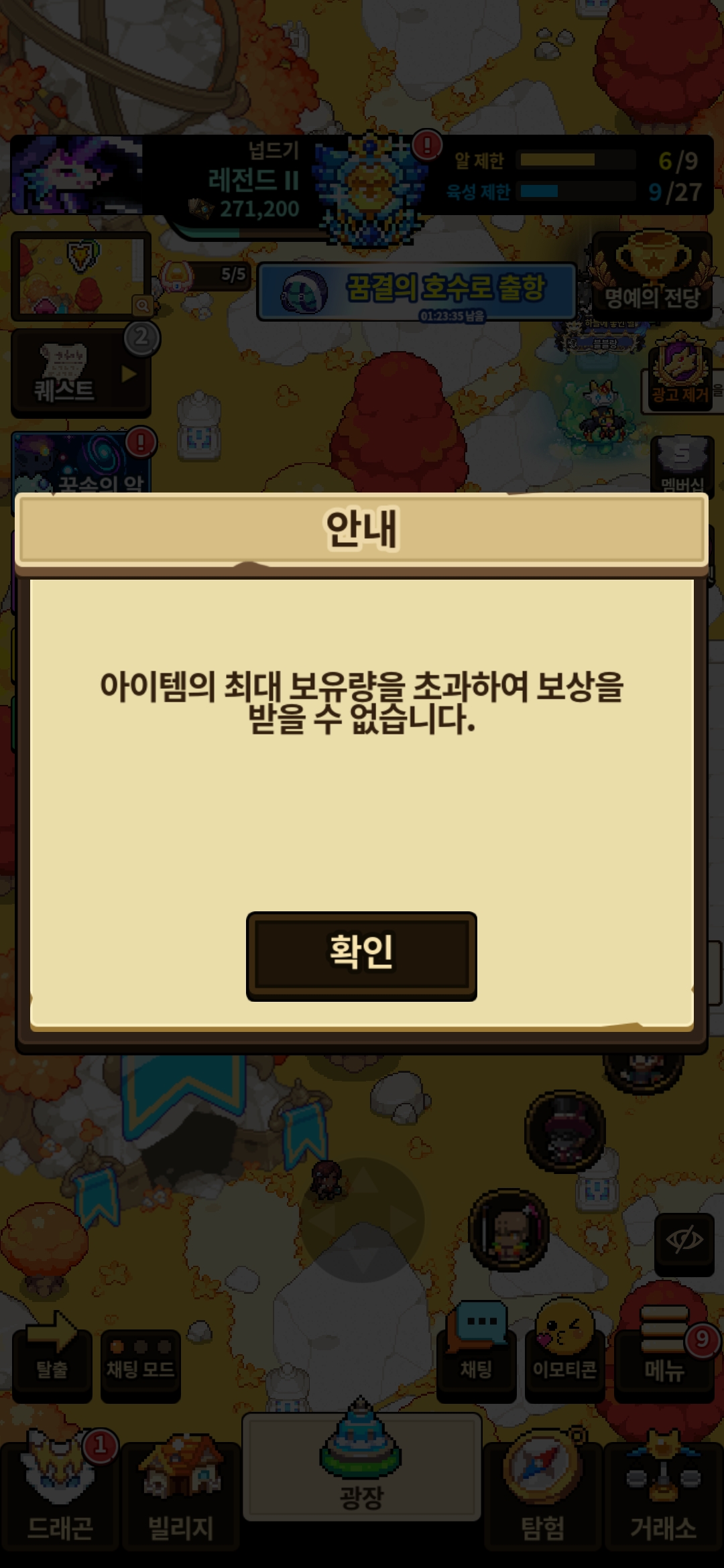 이거 대체 왜 이러나요.. 루민디스 동상 받으려고 누르자 이렇게 뜨네요. 재접해도 받아지지 않고, 빌리지 아이템 창에도 루민디스 동상은 없습니다. 다른 드래곤으로 파트너를 바꿔도 퀘스트는 사라지지 않고 떠있는데, 어떻게 해결하나요?