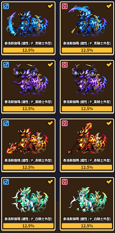以下外觀可透過配種獲得,並可進行交易。