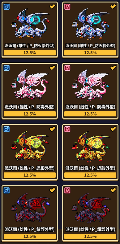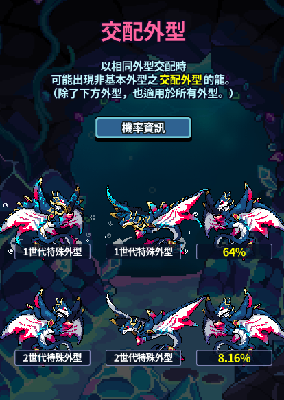 已新增本月龍蛋專用配種公式:無論時間,只要第一代為相同外型進行配種,即有機率獲得特殊的外觀第二代。
