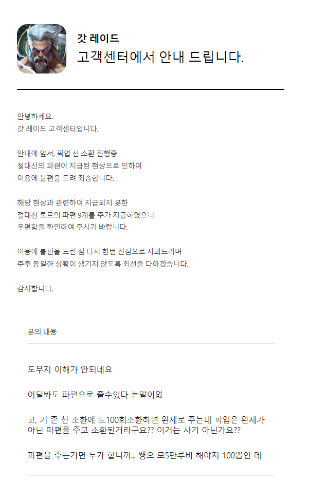 답변이왔고 추가로 파편 9개 받았습니다.