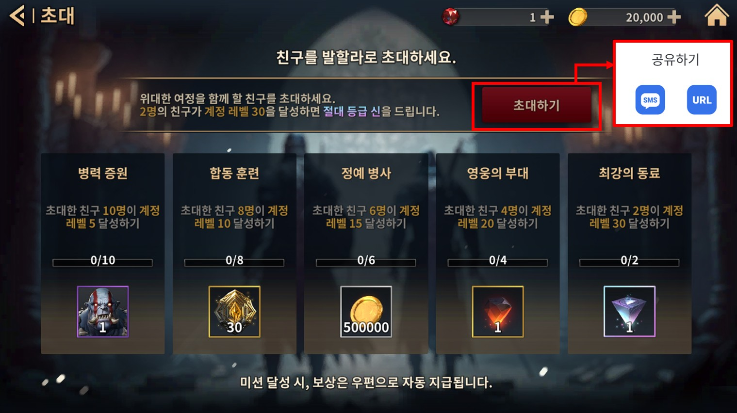4) 초대를 받은 친구가 주어진 미션 달성 시, 단계별 특별 보상 지급