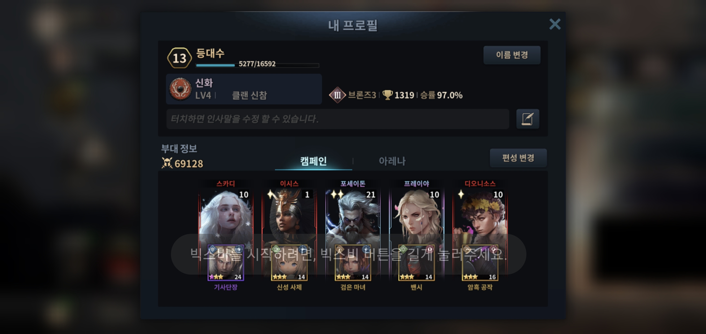 리세 후 3일차 무과금 뉴비계정 어려움 클리어 직전부대모습