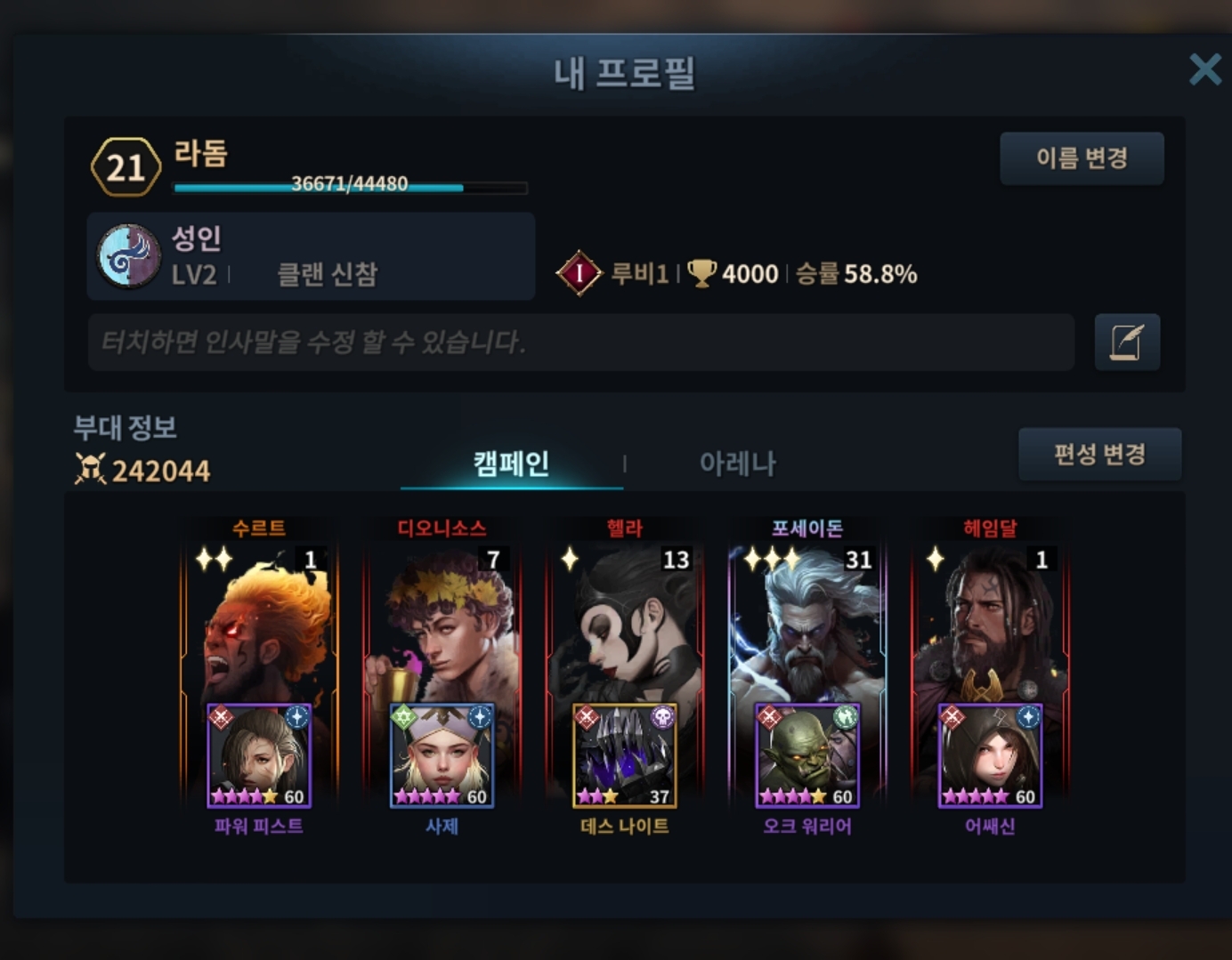 인간 위주로 구성된 버퍼와 함께 전사형 오크 조합입니다. 힐러1,탱커1 있어 방어도 안전합니다.