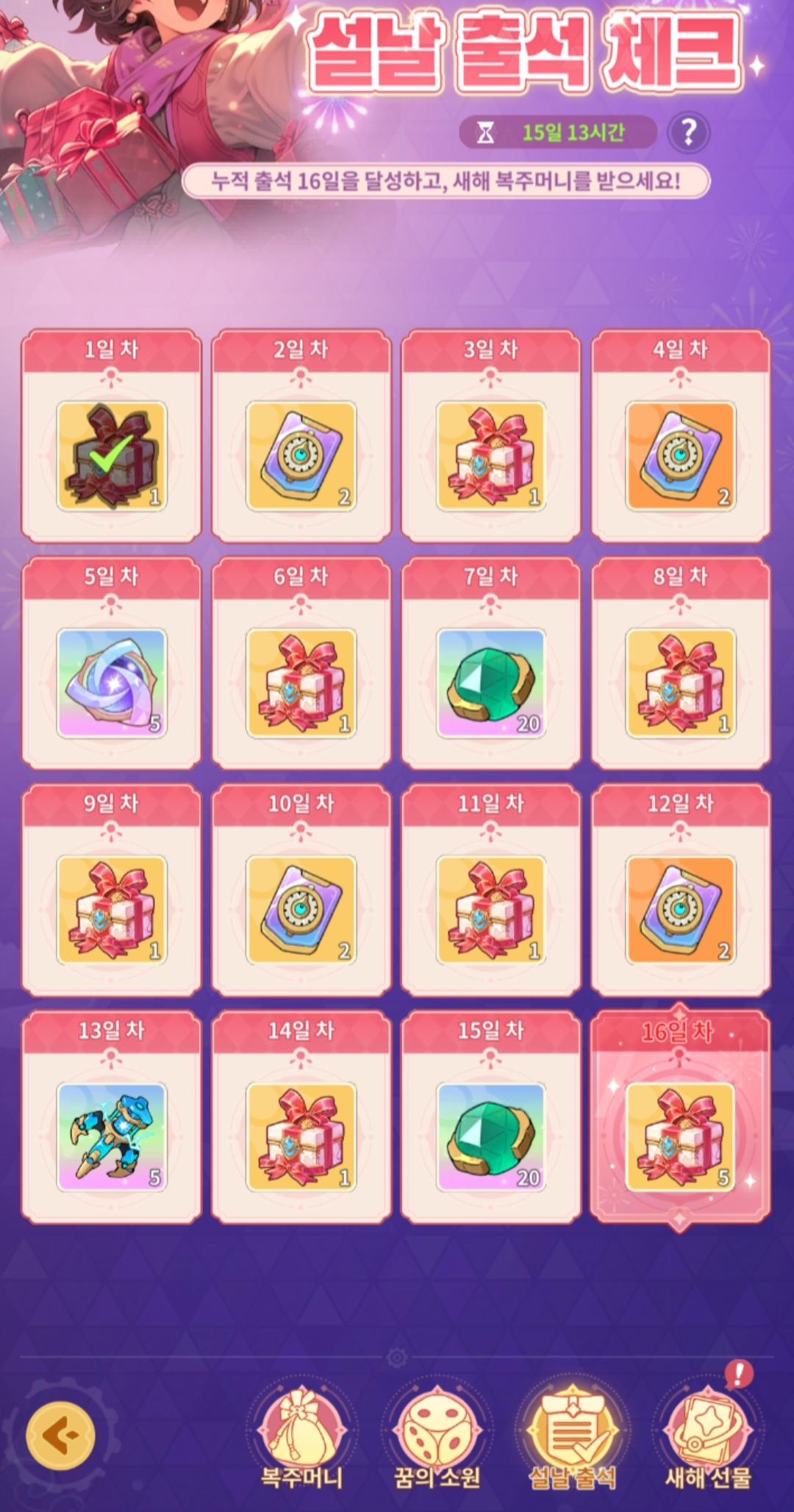 - 매일 매일 접속해 누적 출석 16일을 달성하면 새해 복주머니 지급!