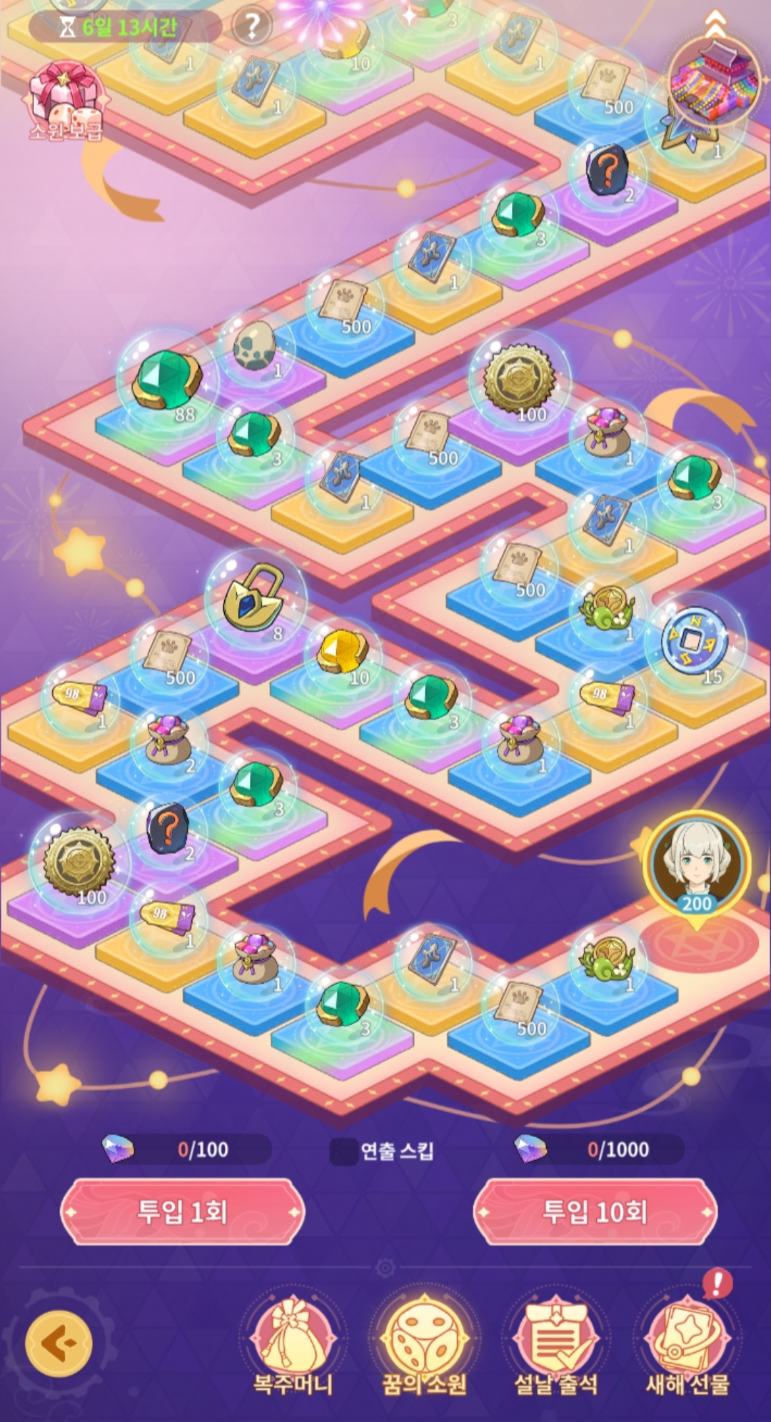 - 주사위 또는 다이아를 사용해 말판을 움직이고 도착한 칸에 해당하는 보상을 획득합니다.