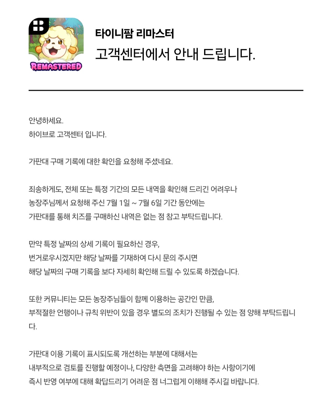 이와 별개로 가판대 물건을 구매한 사람이 누구인지 표기될 수 있도록 편의성 개선이 이루어지길 바랍니다 ~