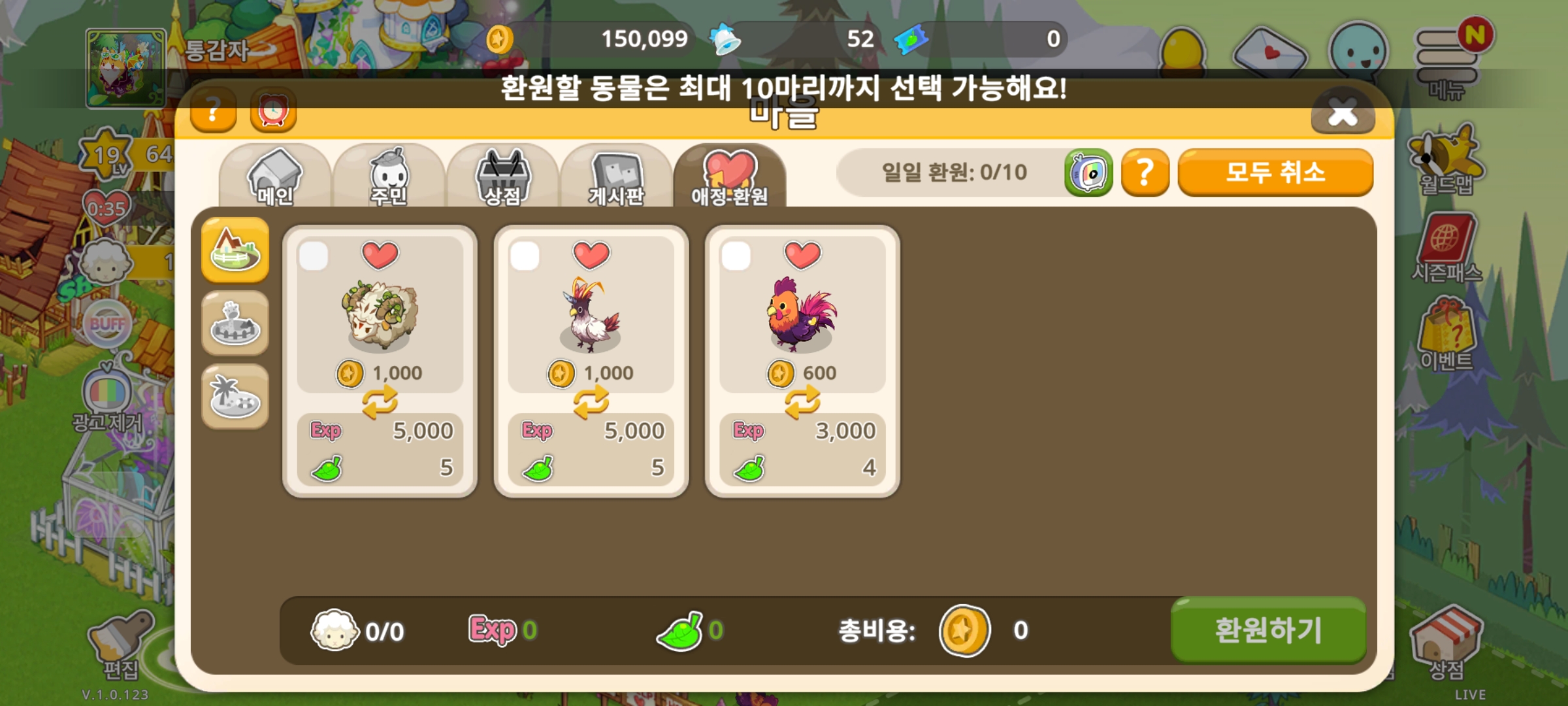 환원 하려고 리스트에서 동물 클릭하면 저렇게 안내문구 뜨면서 아무 반응이 없는데… 따로 선택하는 방법이 있나요?