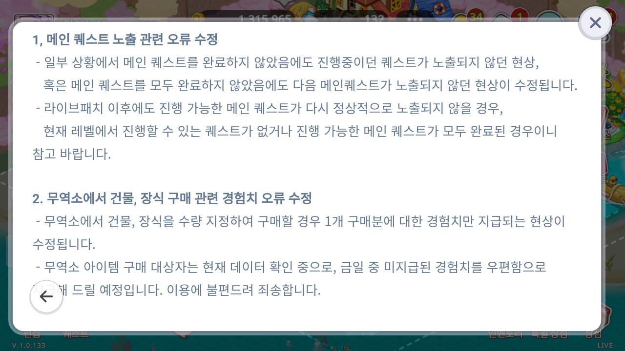 인 게임 공지에는 업뎃 공지 떳어여..퀘스트오류, 무역소 오류 수정 완료
