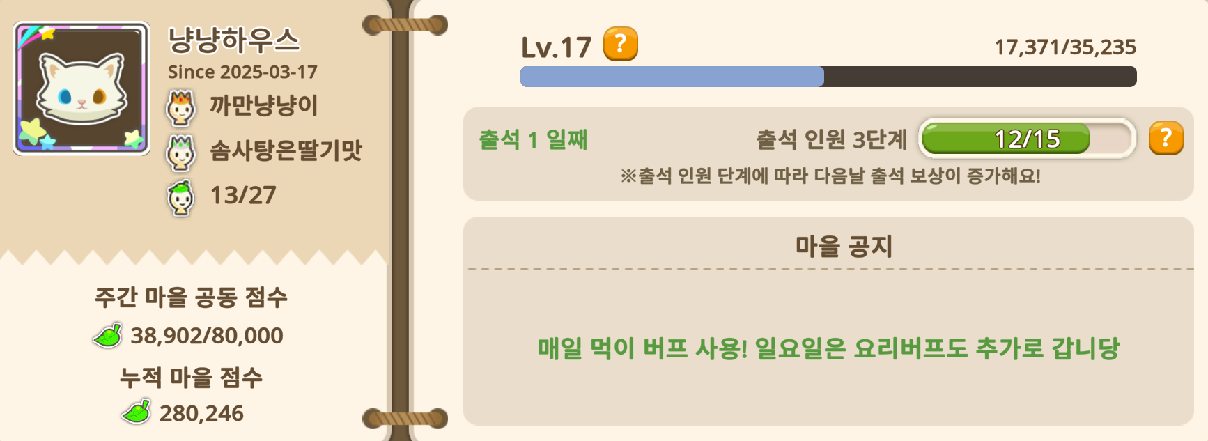 [냥냥하우스] 마을에서 대 모집중! 매일 최고급 먹이 버프 + 일요일 요리버프 사용