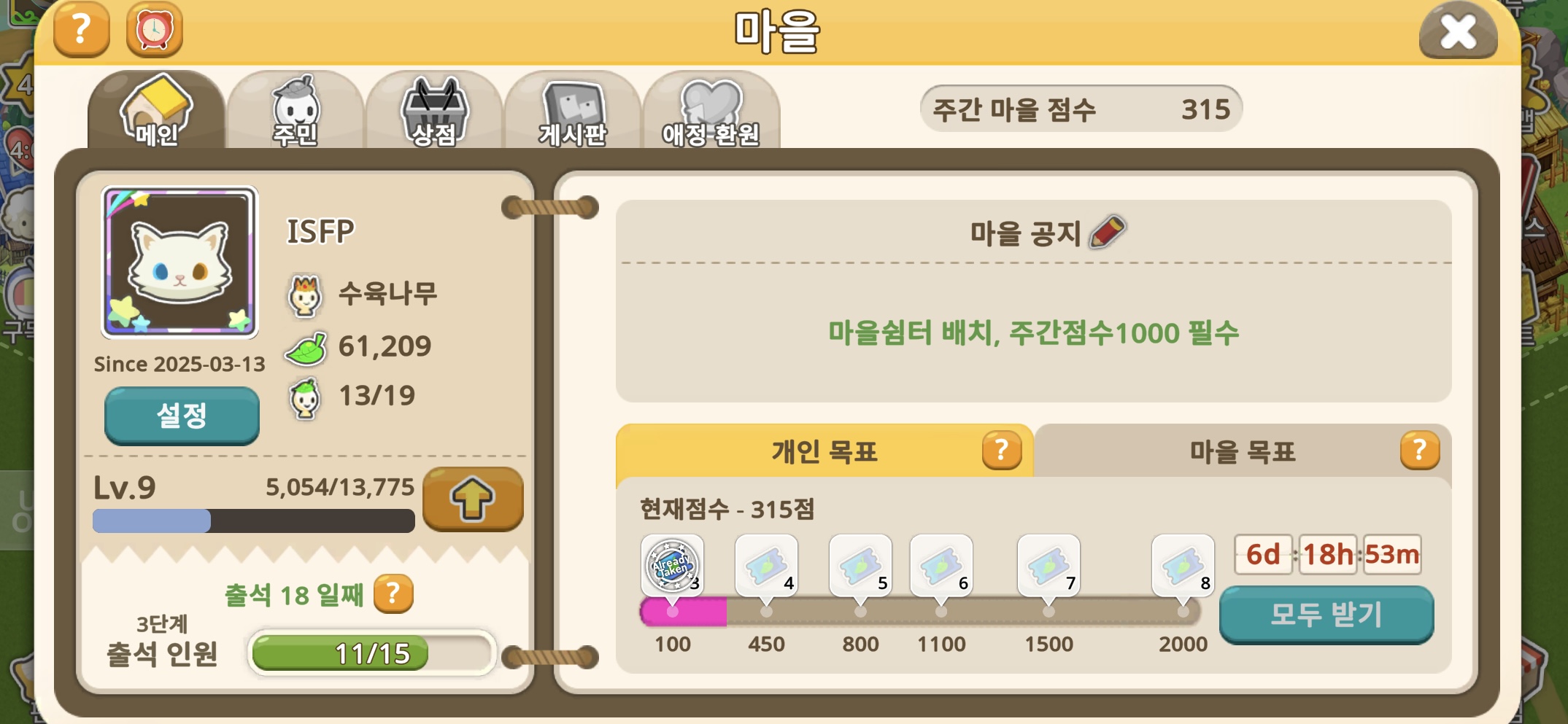 1.마을 쉼터 구매 및 주간점수 1000점만 맞춰주세요.