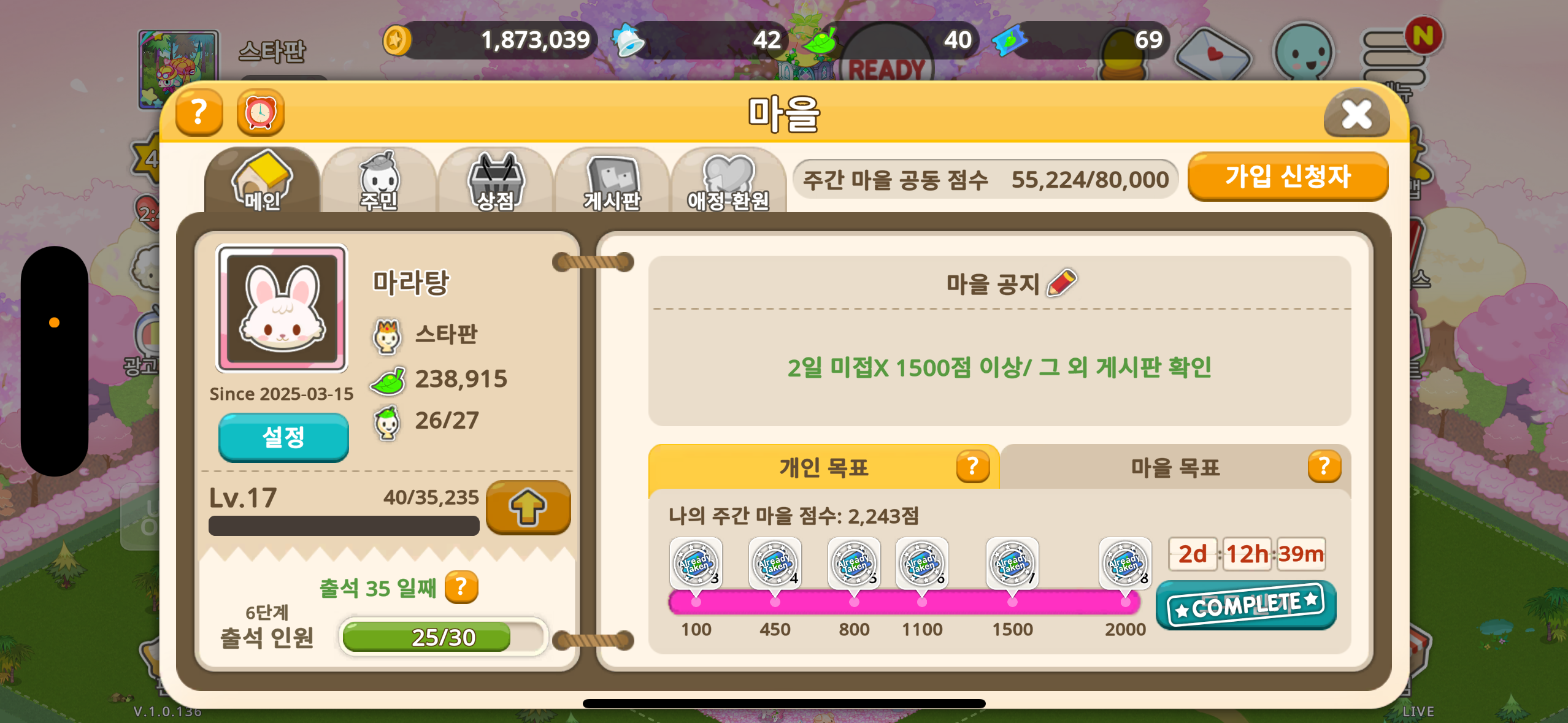 1. 주간 마을 점수 1500점 이상