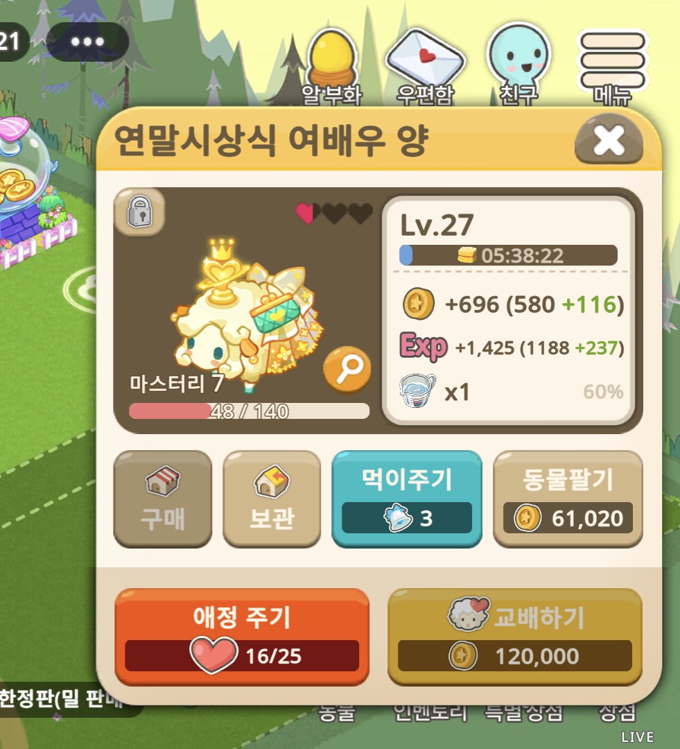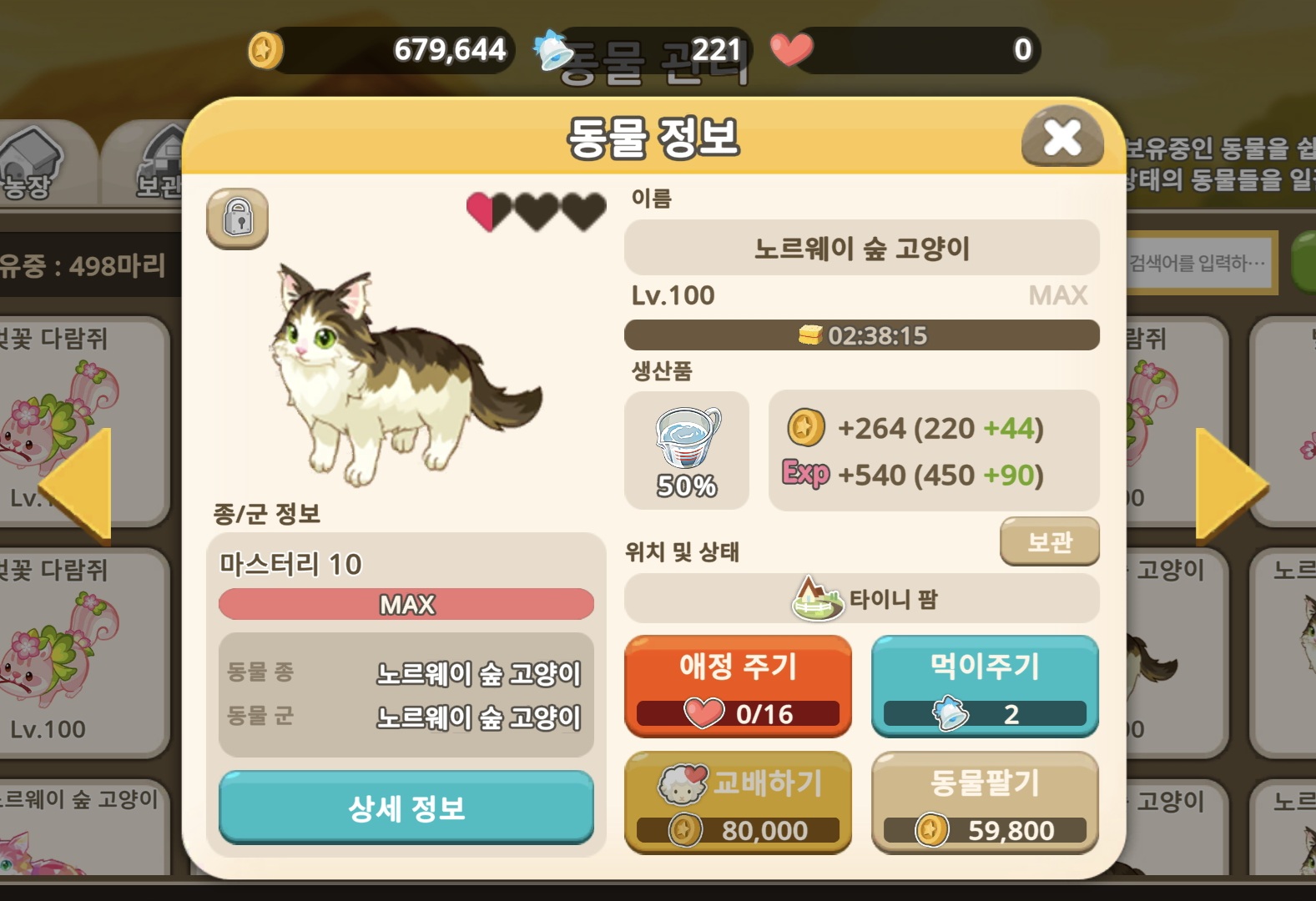 특히, 동물에서 판매하기와 마을에서 교배하기 가 같은 위치에 있어서 실수로 팔게 되더라고요 ㅠㅠ