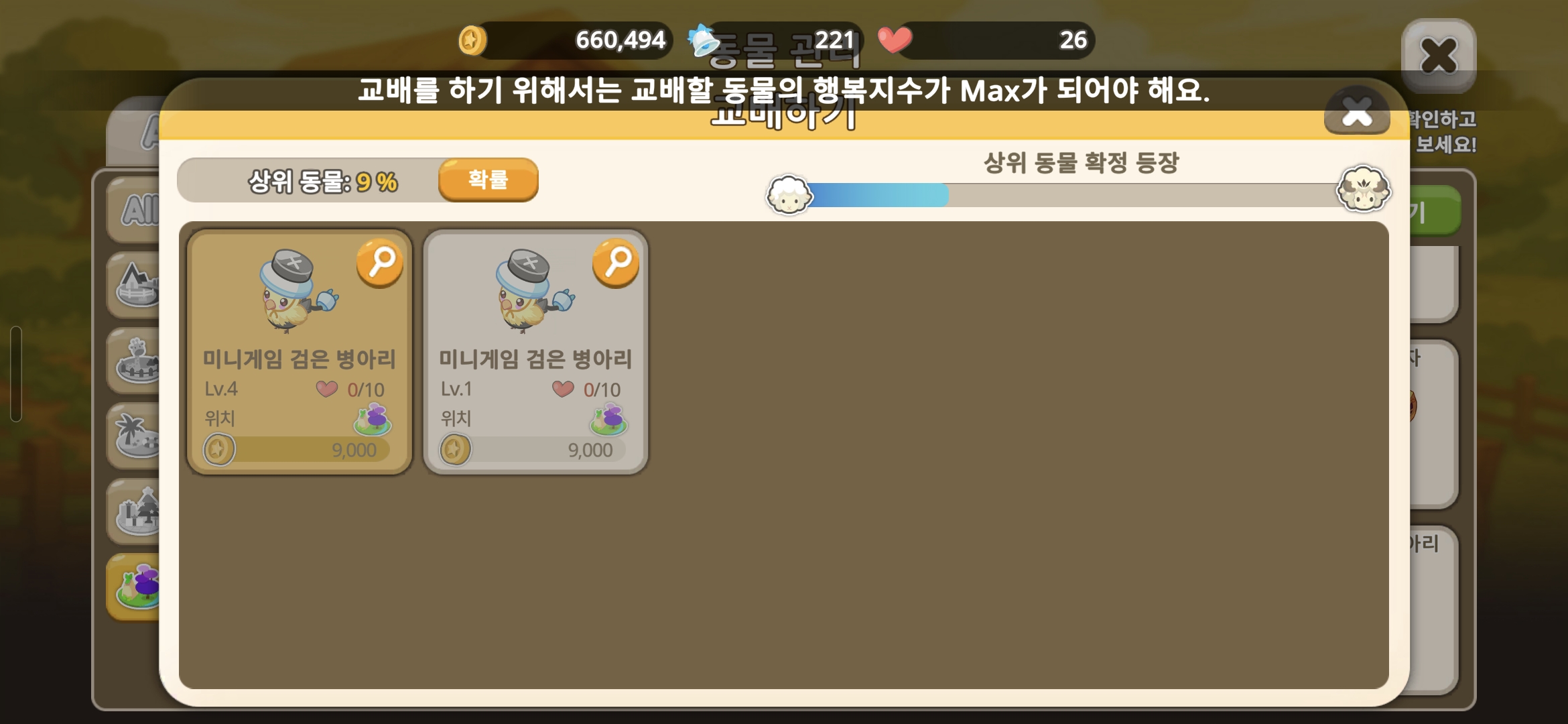 현재 동물탭에서 교배 시 동물창이 그대로 유지되서 좋습니다.