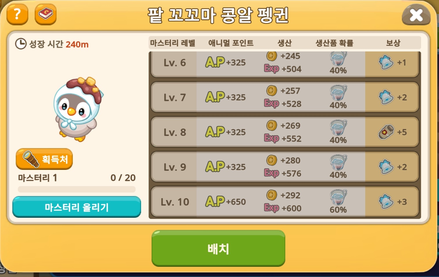 생산품 시간 당 +15% / 골드 생산 시간 당 +74.25 / 경험치 생산 시간 당 +150