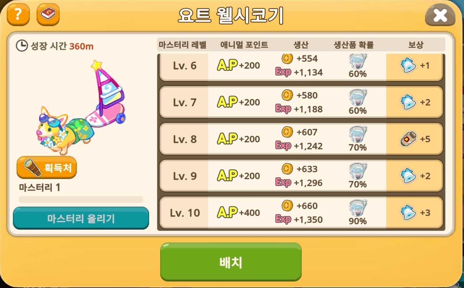 생산품 시간 당 +15% / 골드 생산 시간 당 +110 / 경험치 생산 시간 당 +225