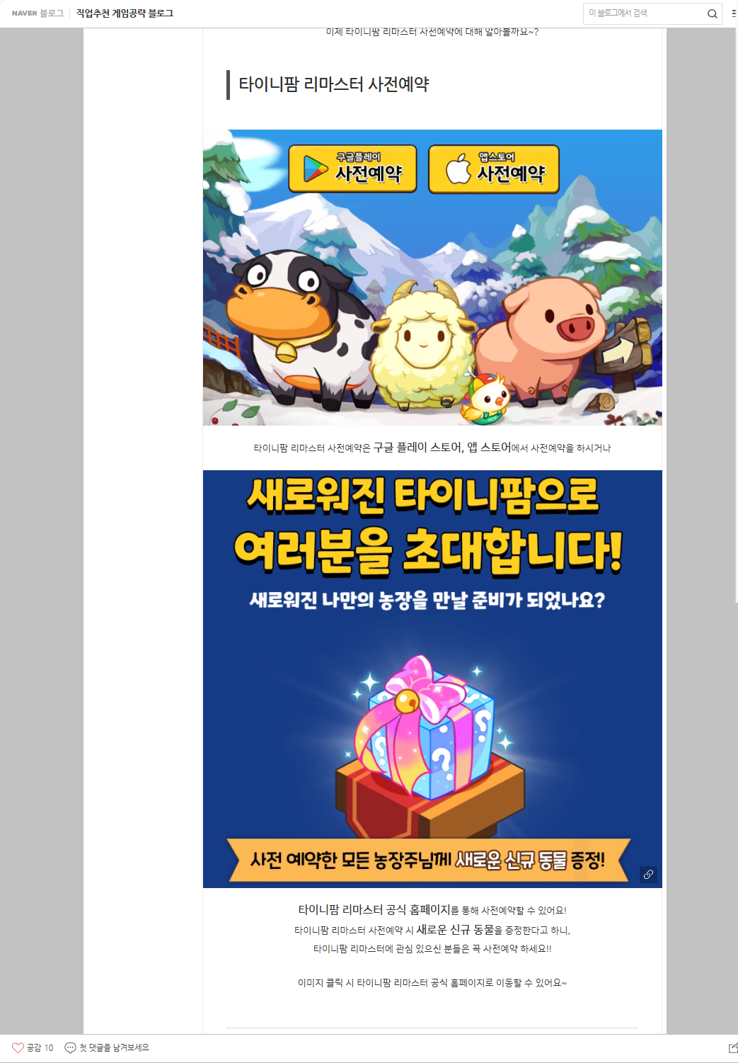 아래 사진은 네이버에 타이니팜 리마스터 검색 시 가장 상위에 뜨는 블로그 글입니다.