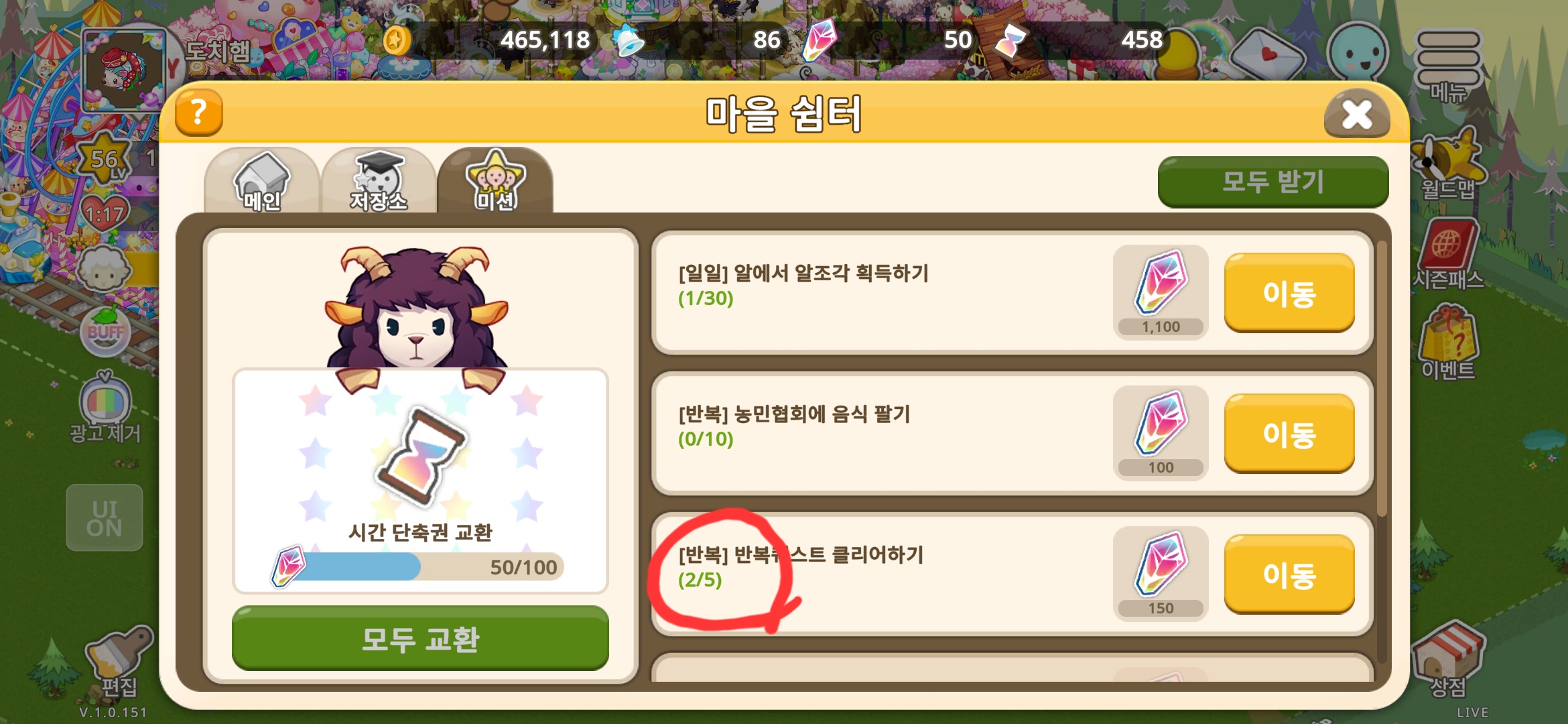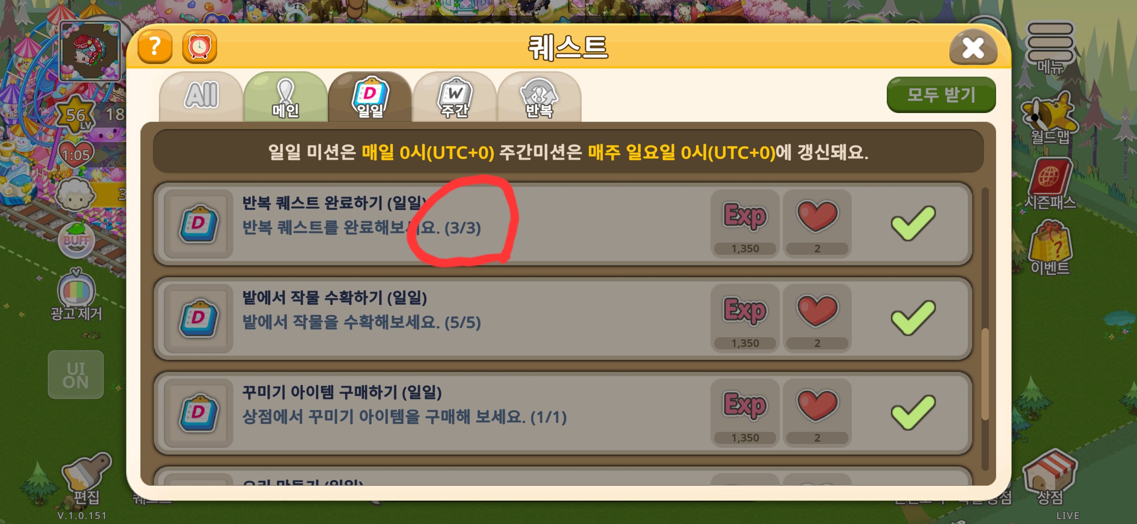 일일퀘스트 리스트 중 반복퀘스트 3회 완료하기 달성 이후에 2번 더 반복퀘스트를 완료해서 총 5번 반복퀘스트를 완료하였지만, 마을쉼터 미션에 반복퀘스트를 2회 완료했다고 나옵니다..