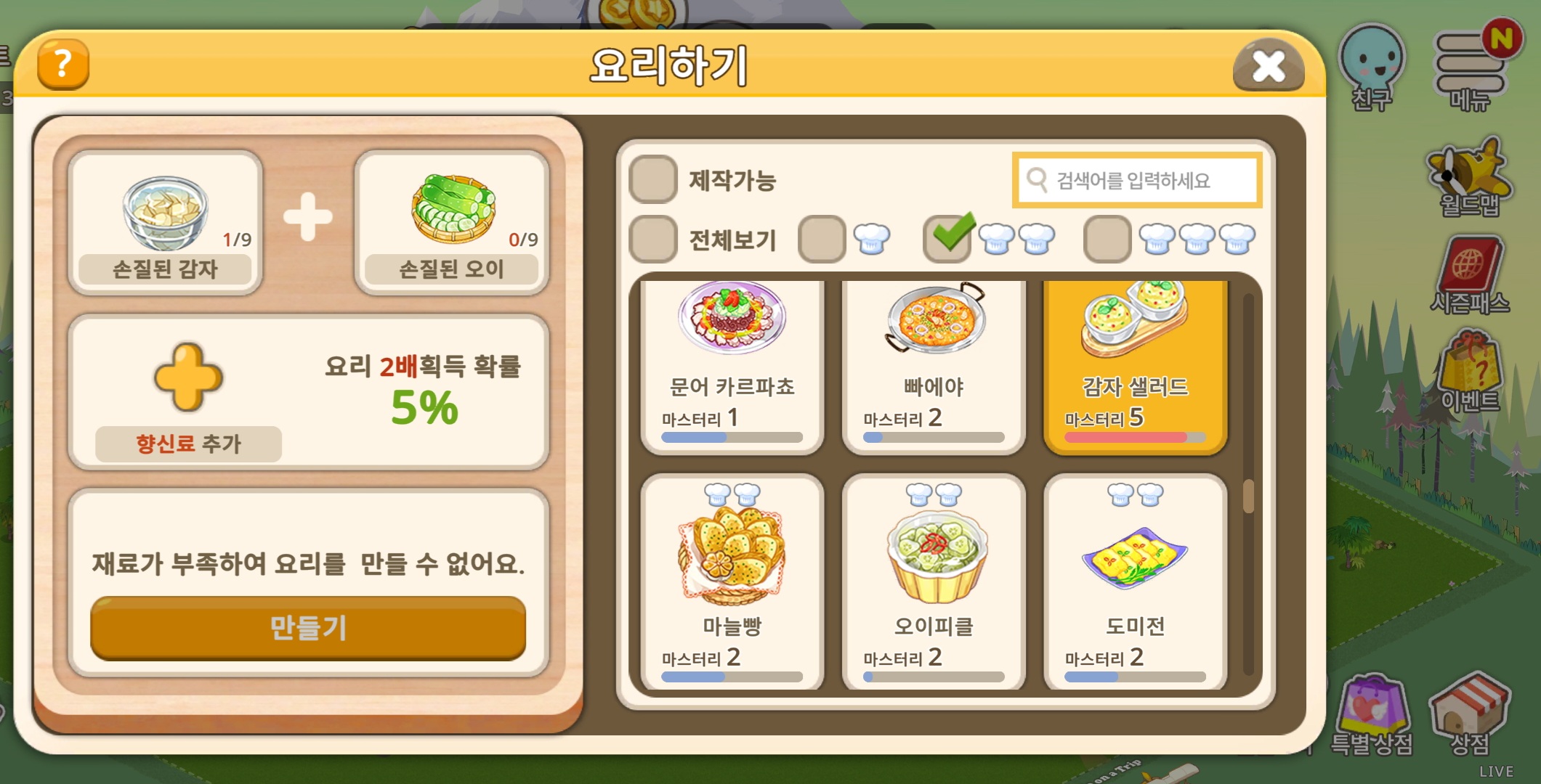감자샐러드를 만들려면 각 9개가 필요하다고 안내되는 화면