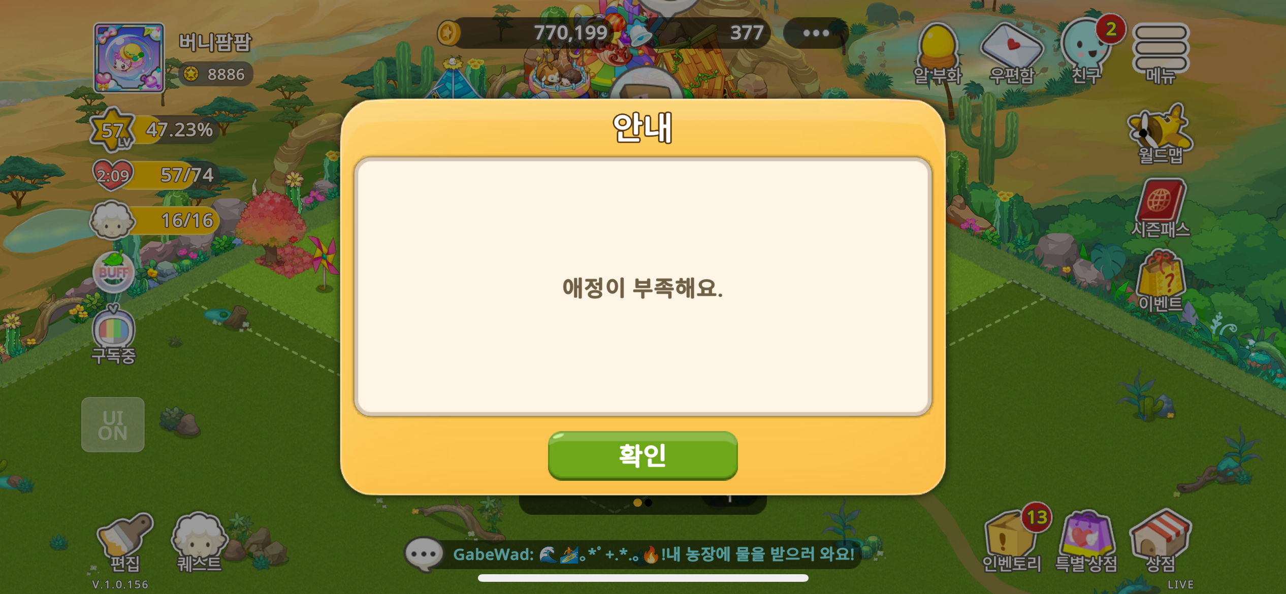 필요한 애정수가 55개였습니다. 하여 “사용하기”를 눌렀는데 애정이 부족하다고 합니다.