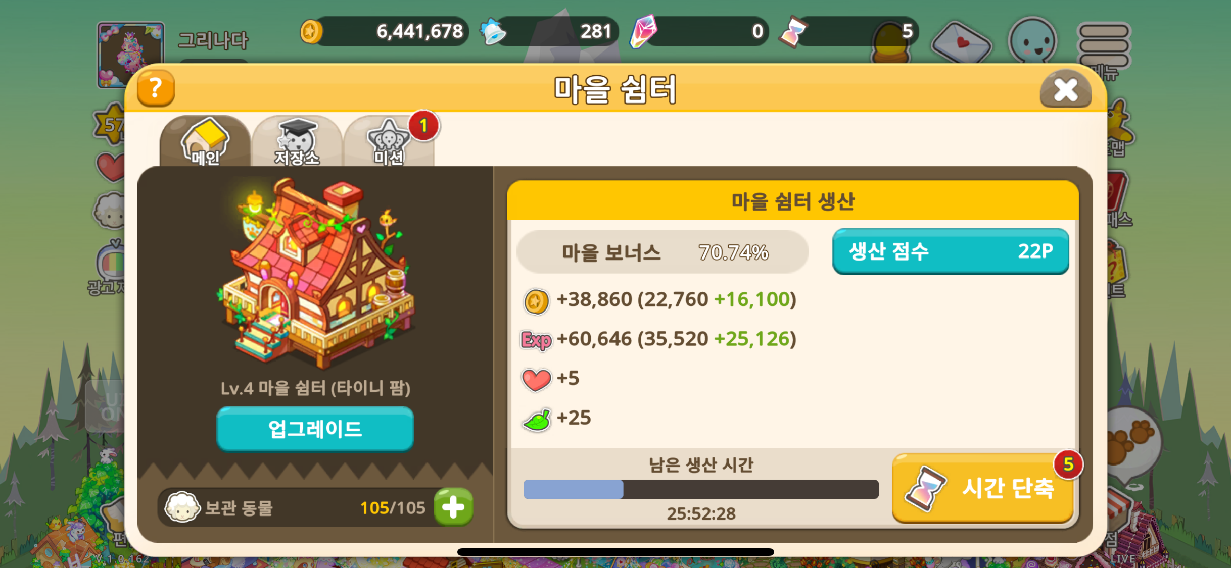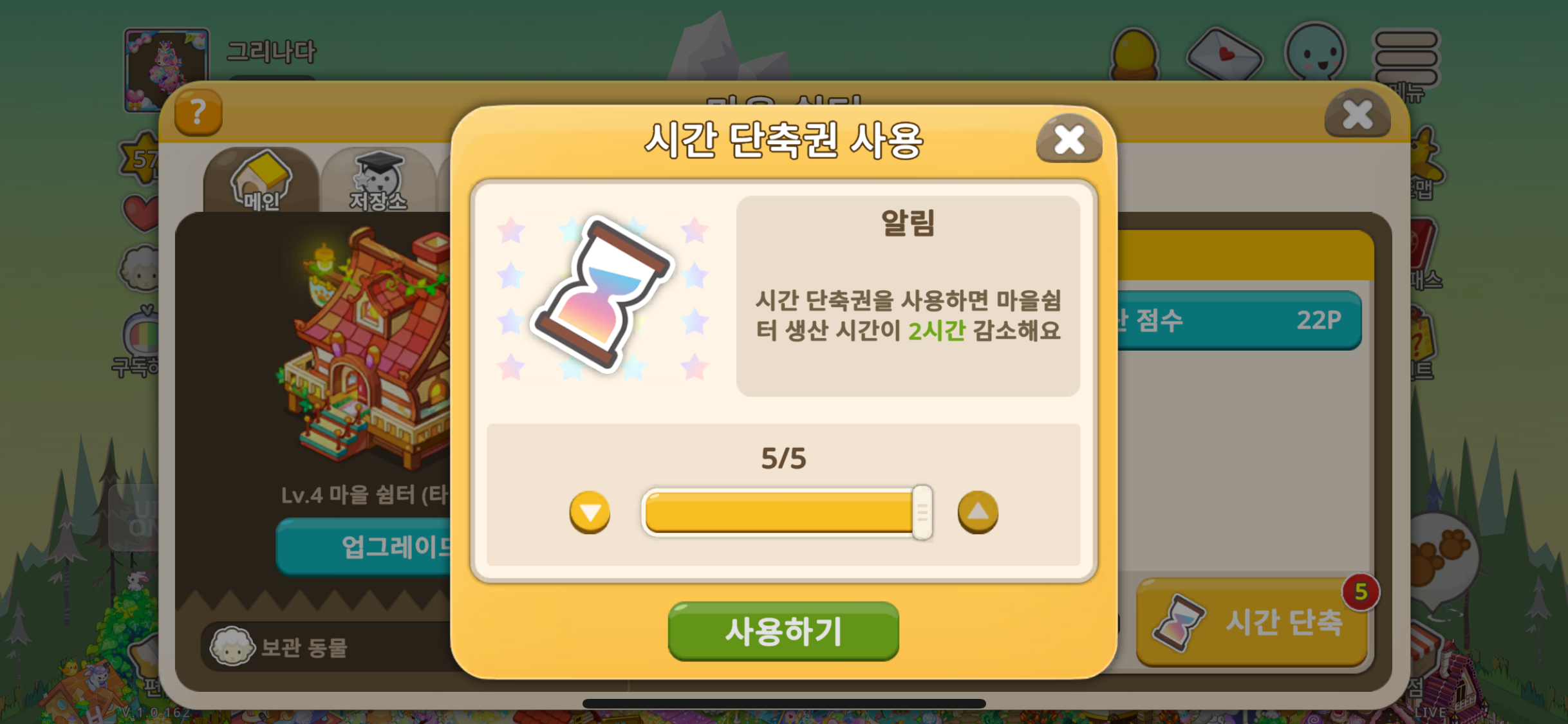 마을 회관은 시간을 줄이려고 시간줄이기 버튼 눌러도 적용이 안됩니다.