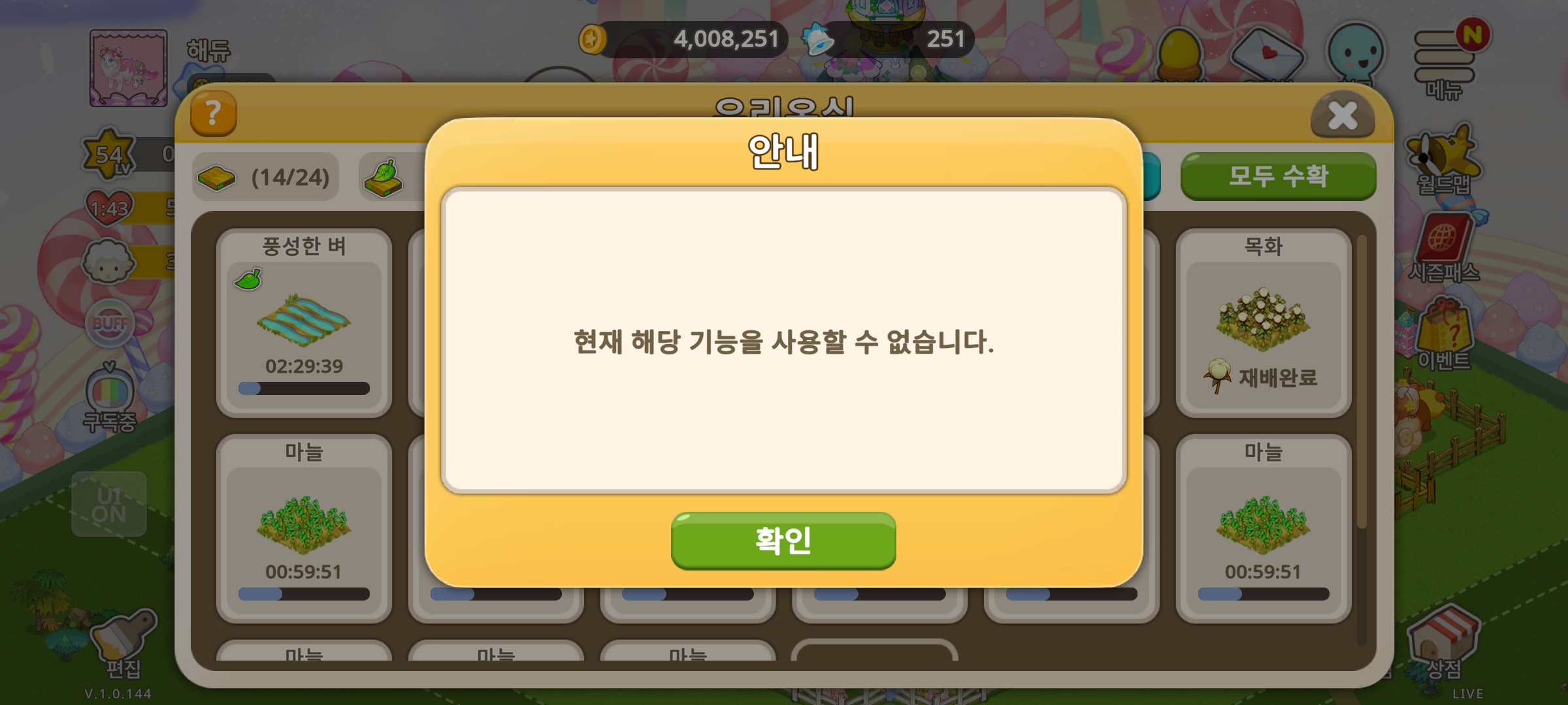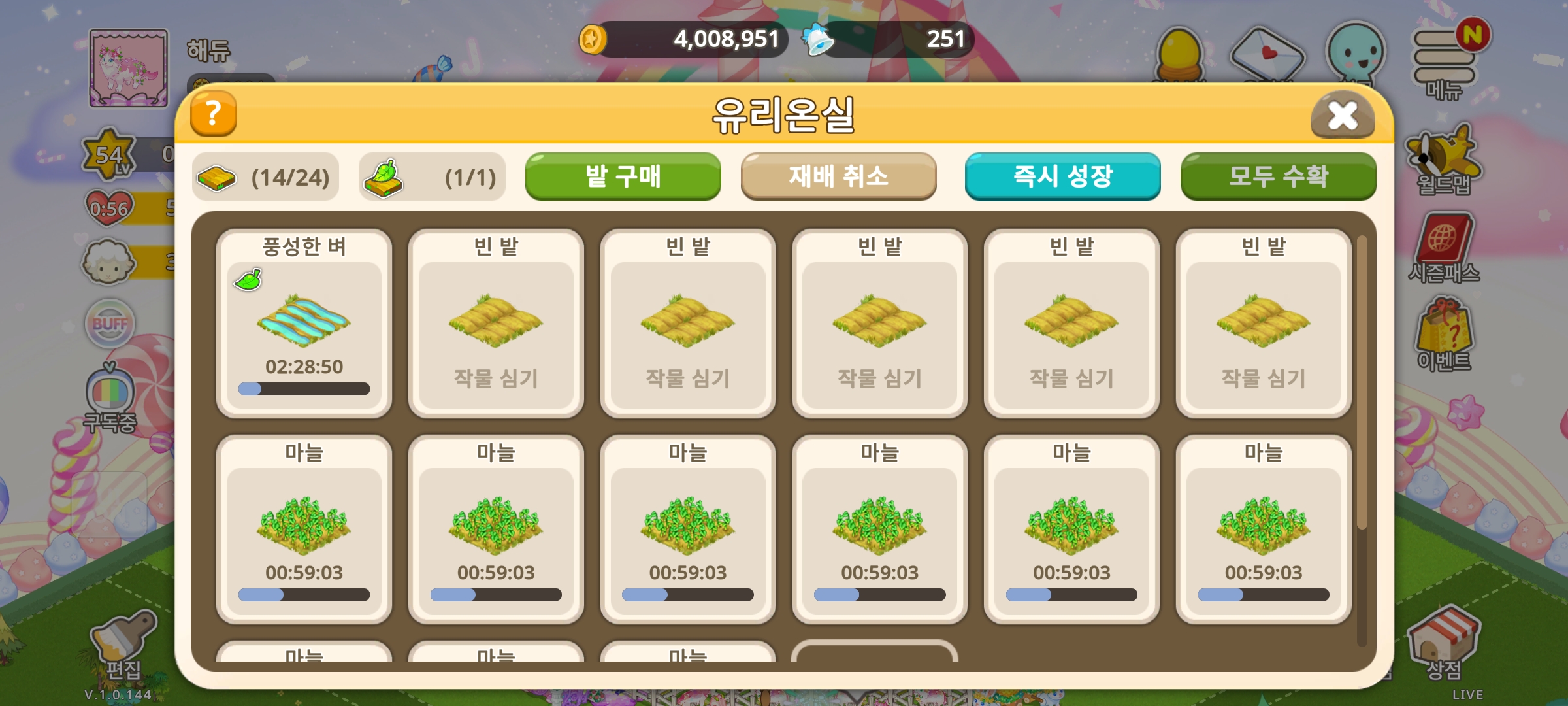 밭 재배 완료 3개 떠 있는 상황에서 밭 창에 들어가있다가, 남은 2개까지 완료되길 기다려서