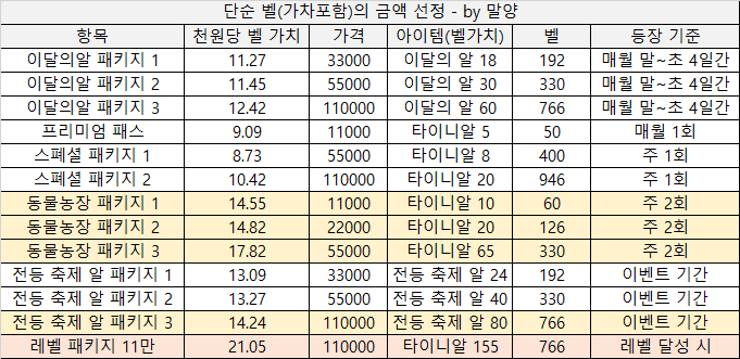 [ 알들은 보통 마일리지 적립형식이 되다보니 그 외 주는 재화들은 벨 가치를 별도로 결정하지 않았습니다. ]