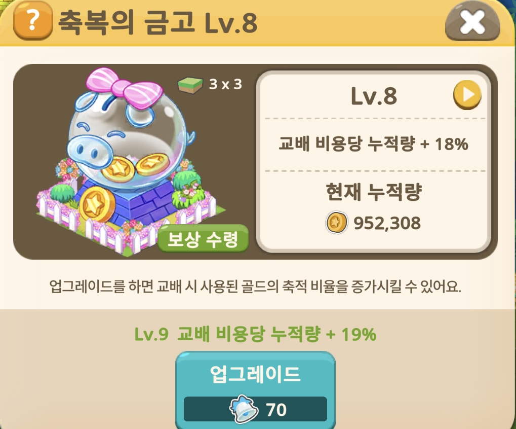 농장 확장 → 더 많은 동물 깔끔하게 배치·건물 배치·농장 꾸미기 = 골드 필요