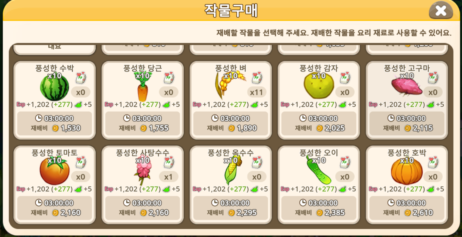 마을 밭 : 기본 밭에서 생산 시간이 긴 작물 추천 EX) 벼, 호박 등
